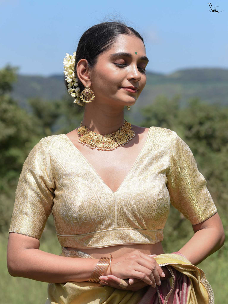 Elegant, radiant, and timeless, the Champagne Gold adds a subtle shimmer to any saree look. Crafted from luxurious brocade fabric, this blouse features intricate floral embroidery, a flattering V-neckline, and half sleeves for a classic appeal. The back-open design with hook closure ensures comfort while maintaining a graceful fit. Perfect for weddings, festive celebrations, or evening occasions, it’s a versatile addition to your festive wardrobe.