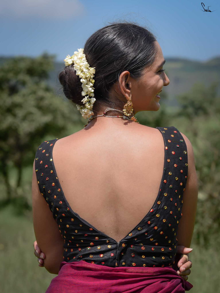 Chic, elegant, and effortlessly festive, the Carbon Gold is a striking addition to your saree wardrobe. Crafted with intricate machine embroidery in playful polka motifs, this sleeveless blouse features a sophisticated dome neckline and a back-open hook closure for a comfortable, flattering fit. Perfect for pairing with festive, wedding, or evening sarees, it brings a touch of glamour and modern charm to any celebration.