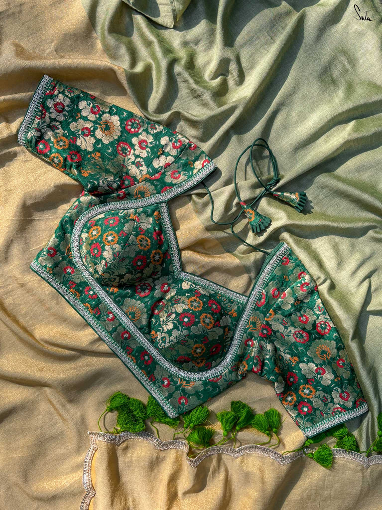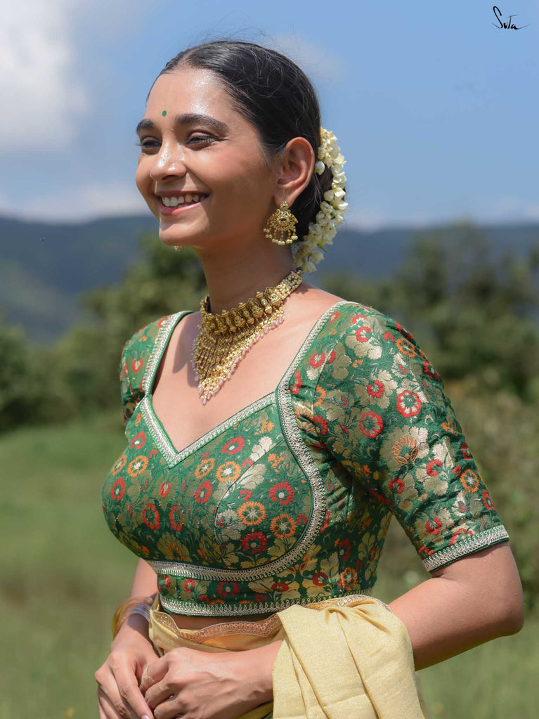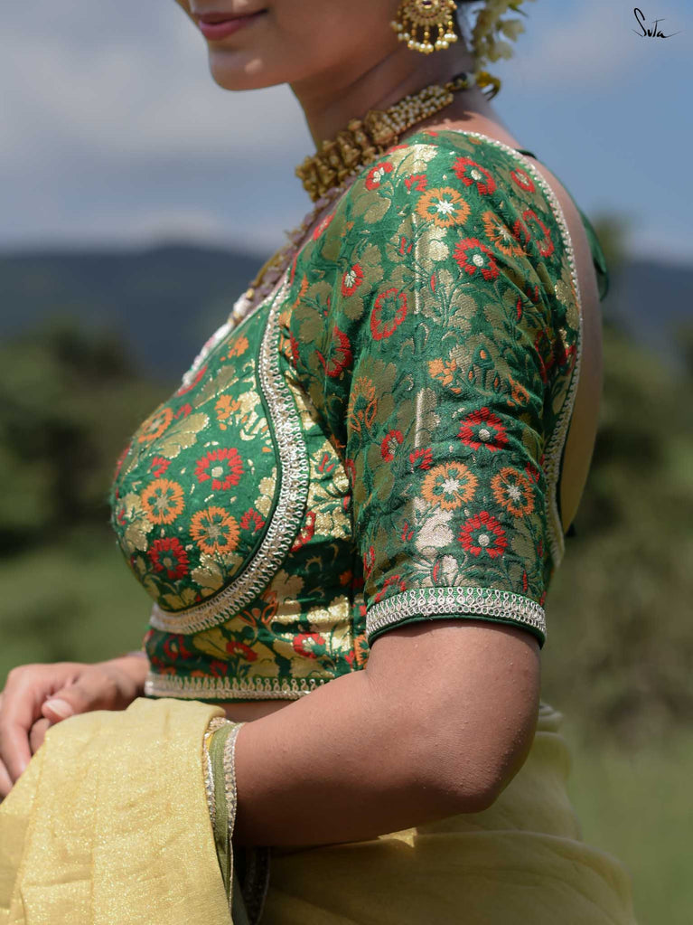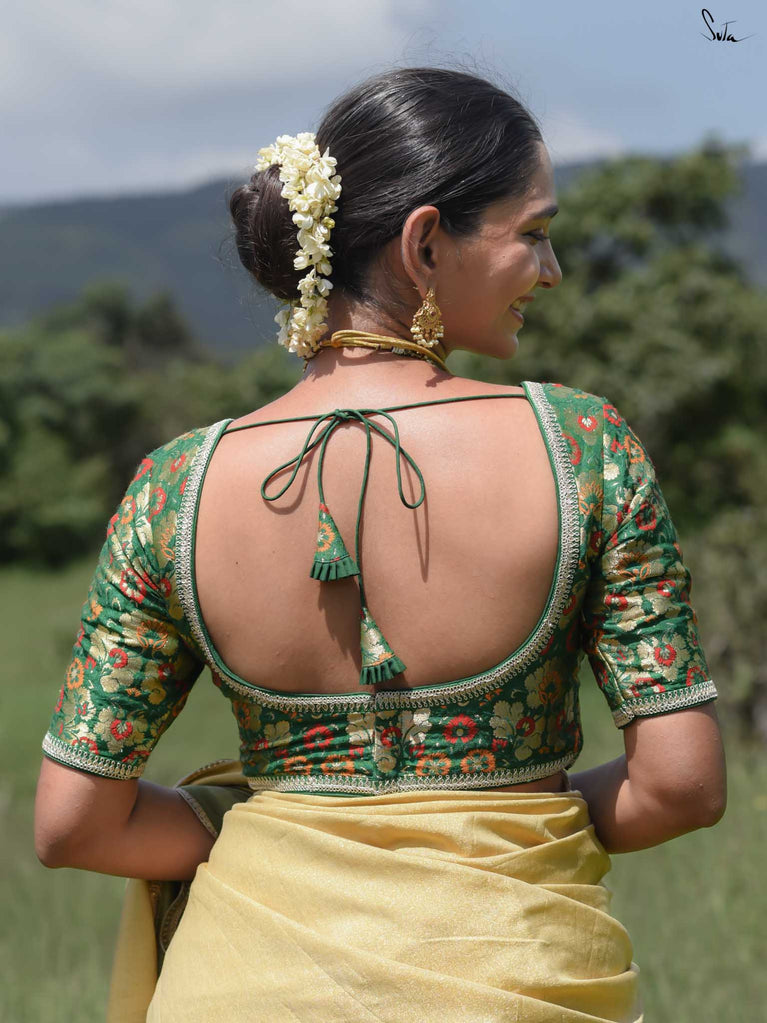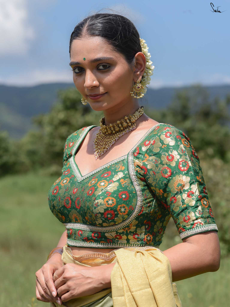 Traditional charm meets festive glamour in the Green Gold. Crafted from rich brocade fabric, this blouse features exquisite machine zari embroidery in intricate floral motifs. The elegant sweetheart neckline and half sleeves bring a timeless appeal, while the back-open hook closure ensures a comfortable and flattering fit. Perfect for pairing with silk or zari sarees, it’s an effortlessly regal choice for weddings and festive celebrations.