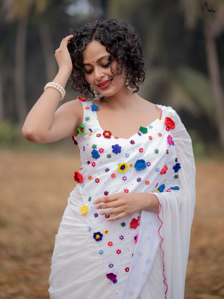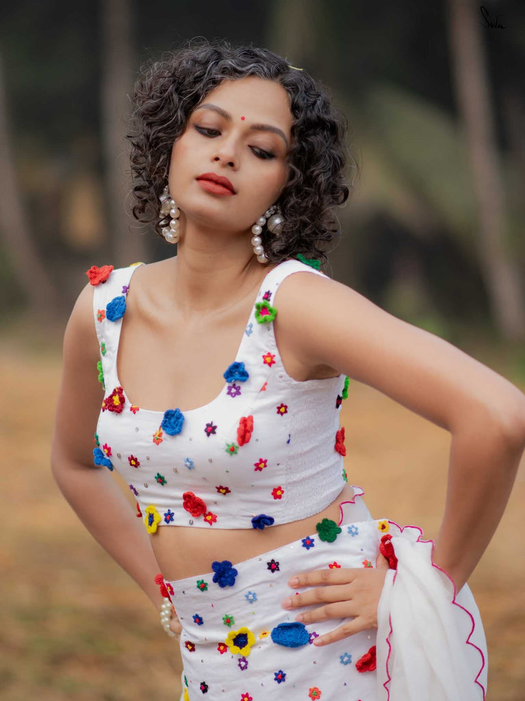 The model is wearing size S blouse and the saree is Dipped in Colours