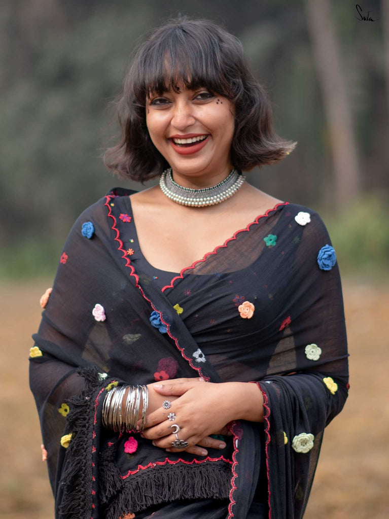 Su, the model is wearing size S blouse and saree is Marigold Scallops.