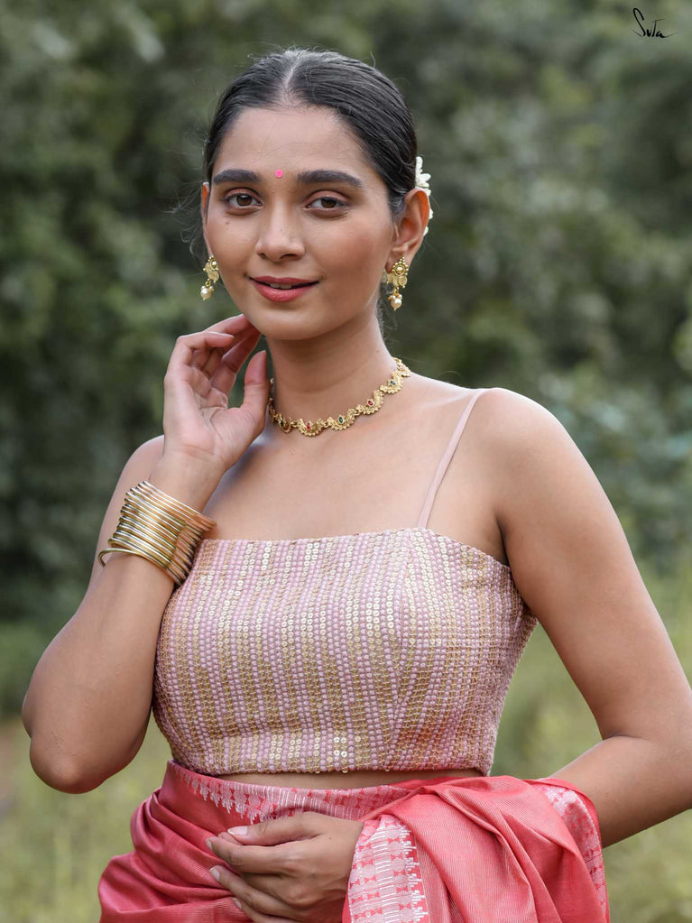 Soft as a secret and radiant as dawn - Asli Chaandi is pure poetry in pink. This sleeveless linen blouse gleams with intricate embroidery that catches the light beautifully, lending it a festive glow. The V neckline adds modern finesse, while the delicate hue keeps things romantic and versatile. Perfect for everything from haldi mornings to evening receptions, this blouse is the real deal - graceful, effortless, and unmistakably you.