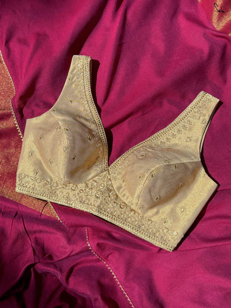 Shimmering, elegant, and festive, the Glitter Gold brings a radiant glow to any saree ensemble. Crafted with intricate machine zari floral embroidery, this sleeveless blouse features a flattering V-neckline and a back-open hook closure for a comfortable and stylish fit. Perfect for weddings, festive celebrations, or evening gatherings, it adds a touch of glamour and timeless charm to traditional attire.
