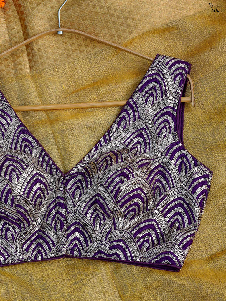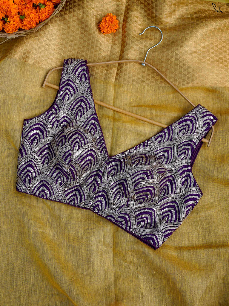 A little shimmer, a little sass, Uski Chaandi is all heart. This purple linen blouse is a playful take on timeless elegance, featuring delicate machine embroidery that glows like starlight. The V neckline and sleeveless cut lend it a modern, flattering silhouette, perfect for drapes that call for a hint of bold charm. It’s that one blouse you’ll reach for again and again when grace needs just a touch of mischief.