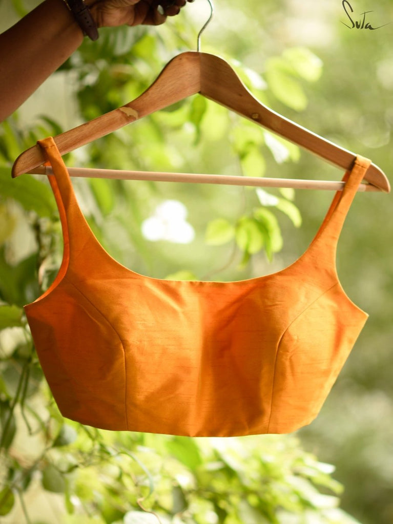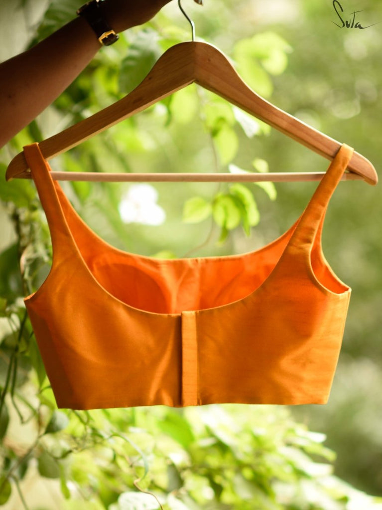 Su, the model is wearing a size S blouse and the sarees are Spiced Orange Pickles and Vivacious-O-Clock