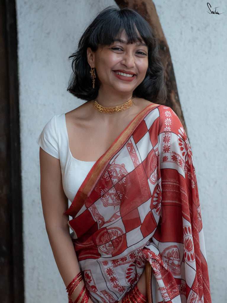 The model is wearing size S blouse and the saree is Shaadi Hai