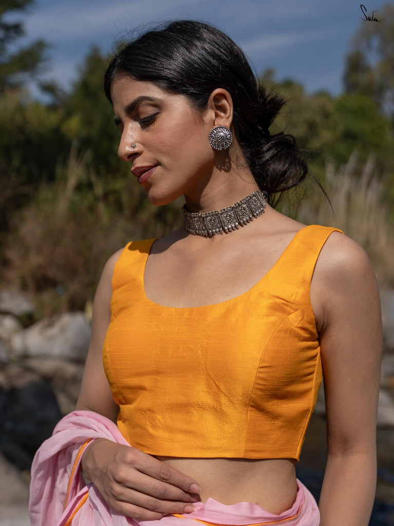 The word 'Apara' means 'uniqueness and superiority'. Just like the name, this bold sleeveless blouse, made up of a radiant yellow hue, reflects the shine and glow of the unique nature! Tailored to perfection and being a perfect fit for every event, the blouse ensures the utmost comfort and sophistication. Delve deep into the beauty of the art and artisans, with a blouse where love and patience poured into every stitch.