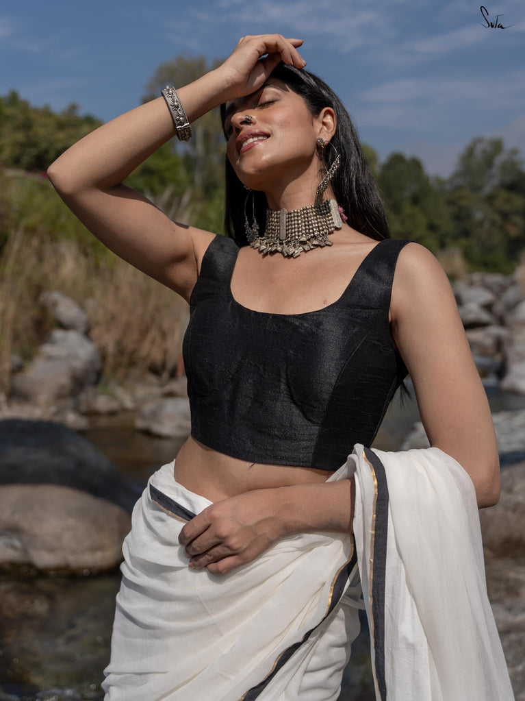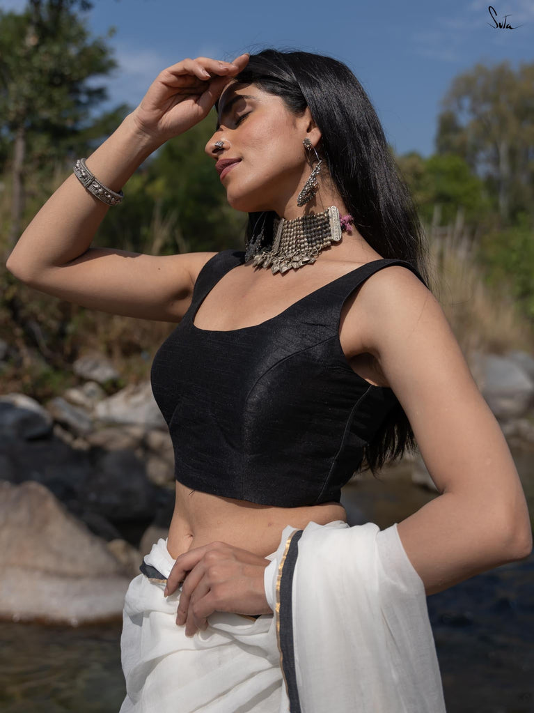 The word 'Suki' stands for 'Beloved'. Staying true to its name, this bold sleeveless blouse, dipped in the luxurious hue of black, is all set to make you fall in love with it. Tailored to perfection and being a perfect fit for every event, the blouse ensures the utmost comfort and sophistication. Delve deep into the beauty of the art and artisans, with a blouse where love and patience poured into every stitch.