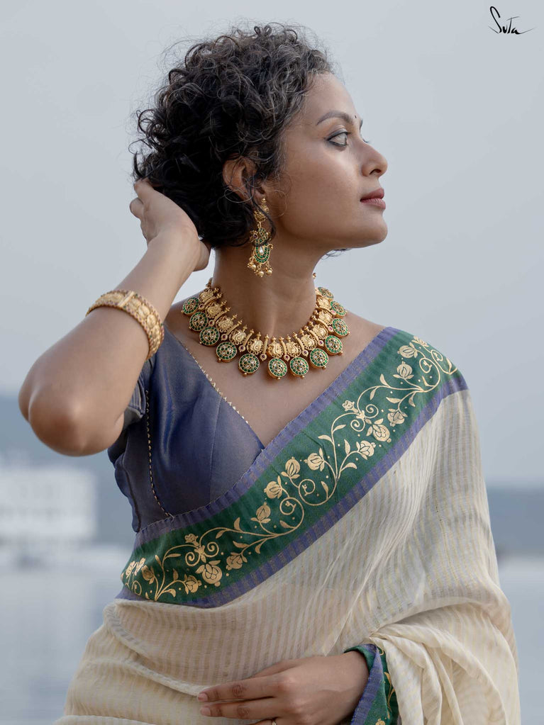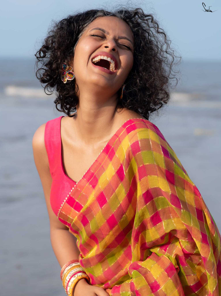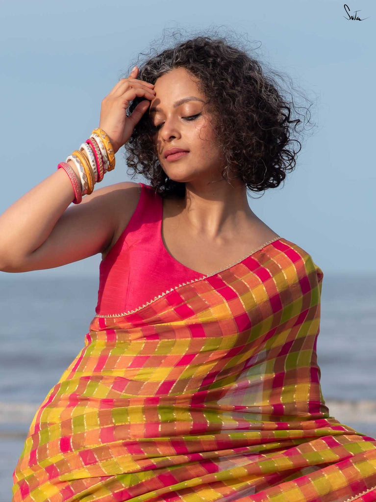 Saree: Su, the model is wearing a size S blouse and the saree called Palash Sa Basant