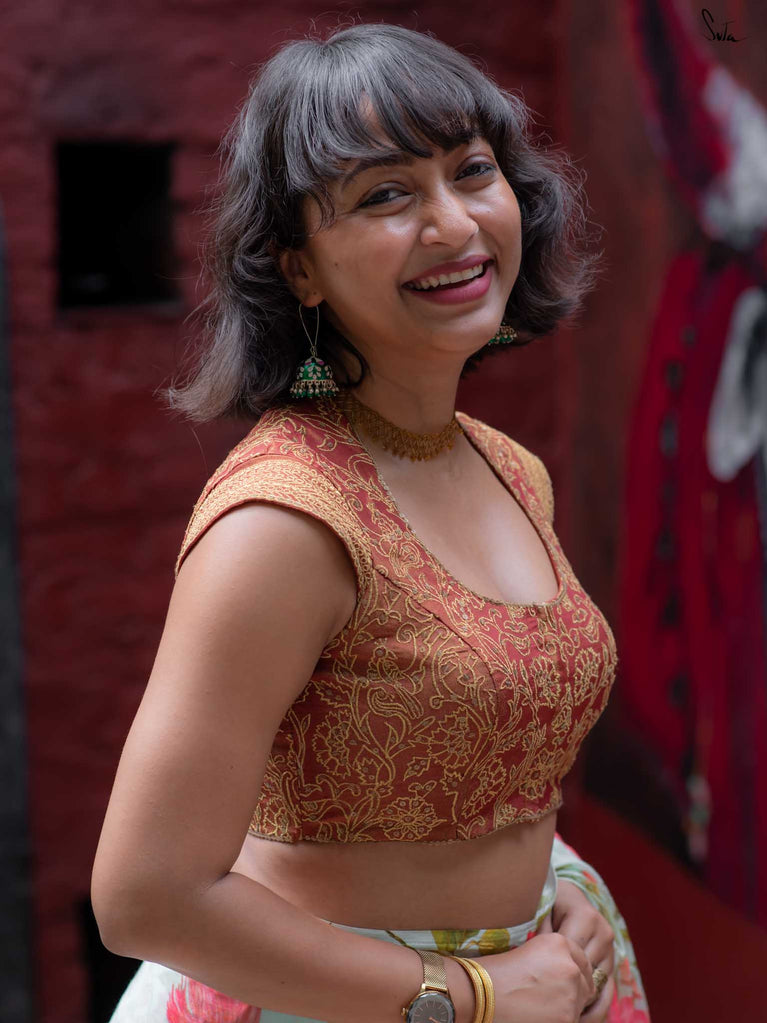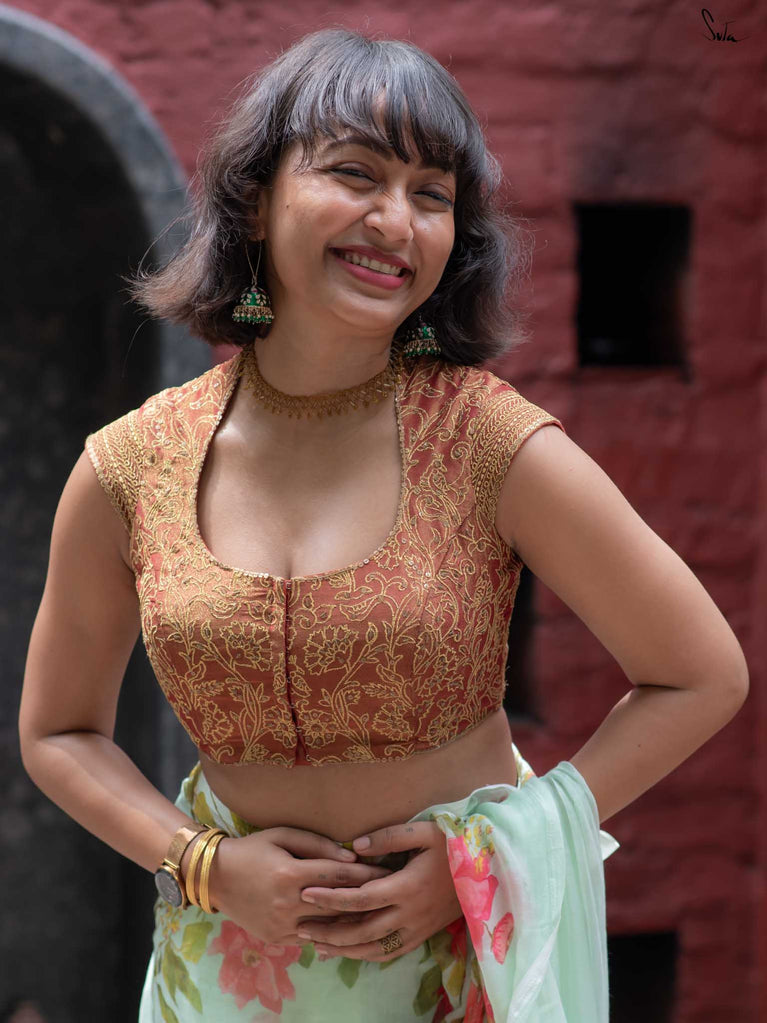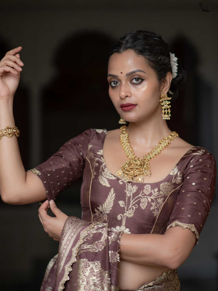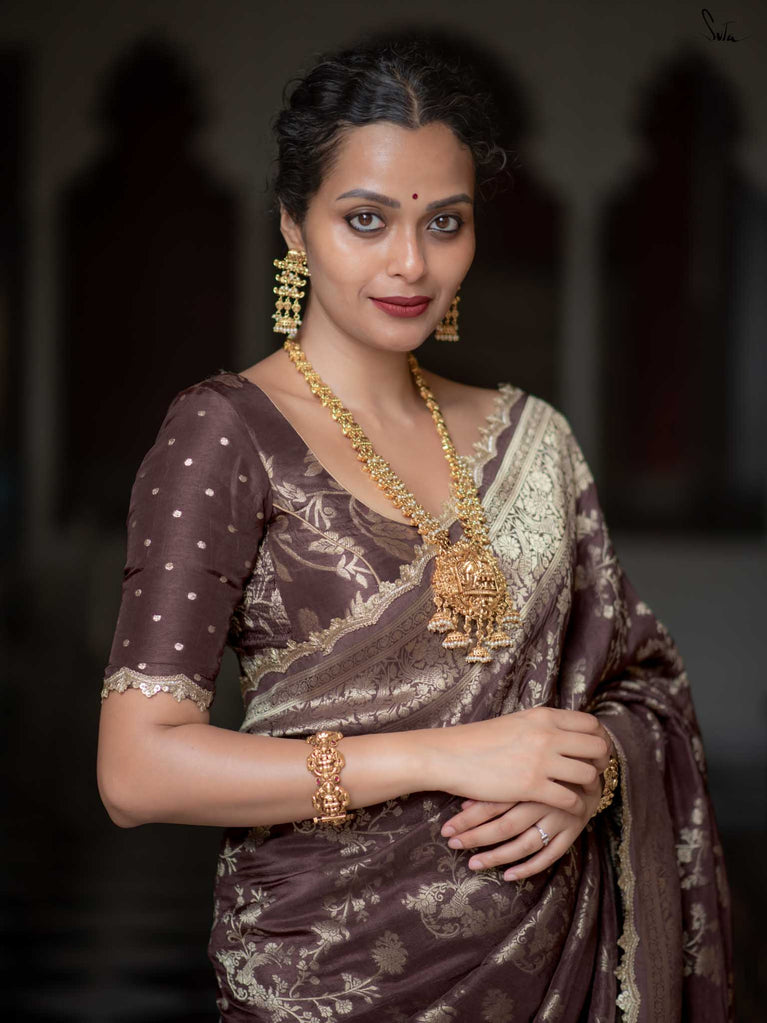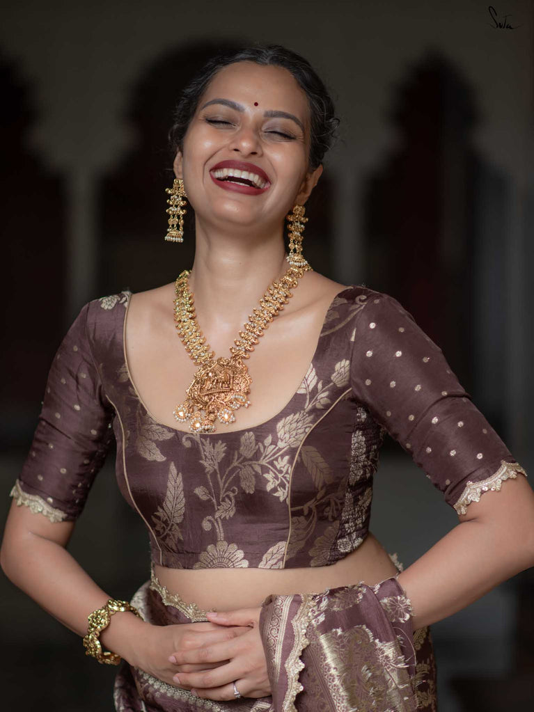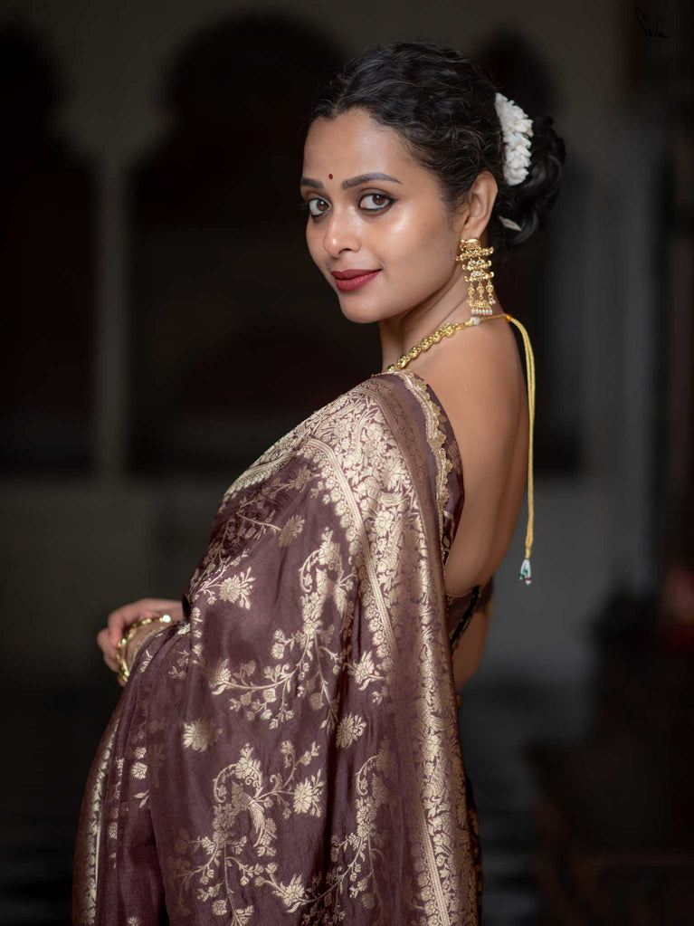 Elevate your festive and wedding look with Caramel Twist, an elegant half-sleeve blouse in rich brown foil organza. Adorned with delicate golden floral foil prints and intricate lace detailing, it exudes understated glamour with every twirl.