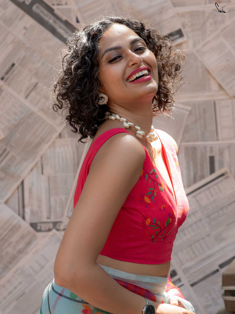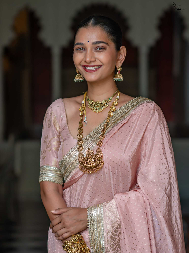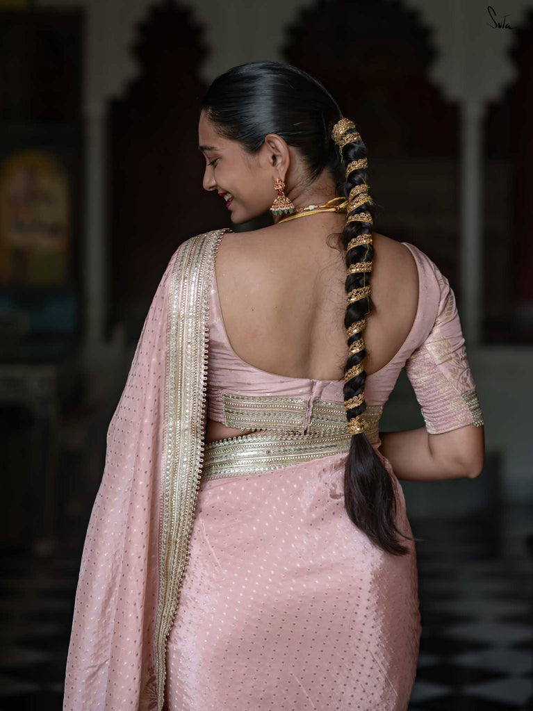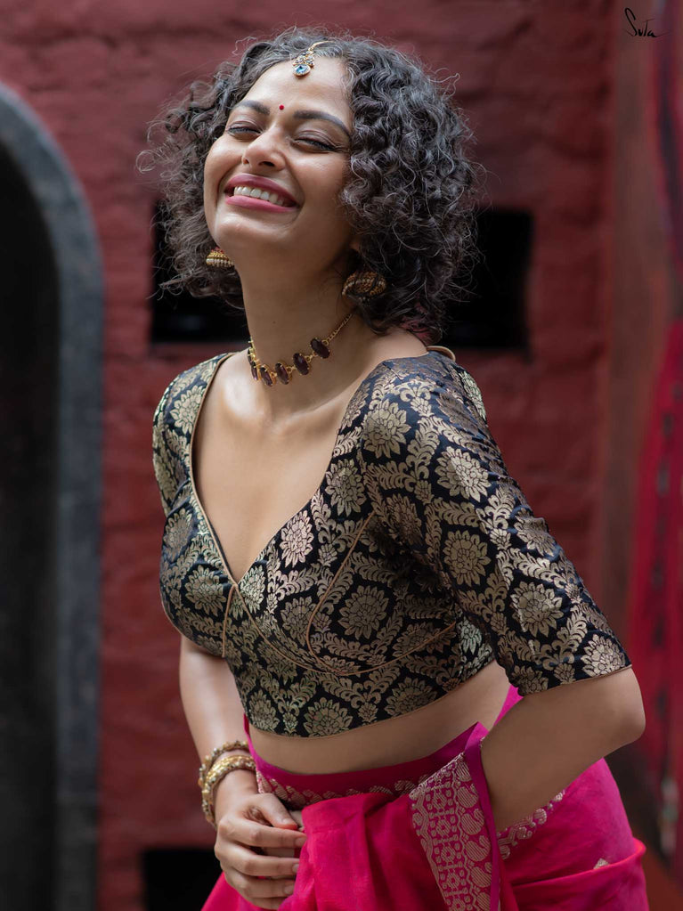 The model is wearing size S blouse and the saree is Gulabi Foil