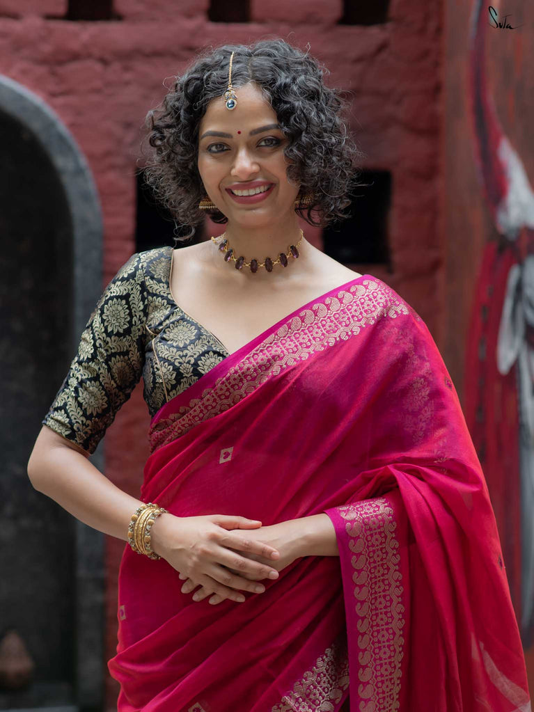 Bright pink viscose blouse with intricate zari embroidery. Modern cuts designed to flatter your silhouette perfectly. Soft fabric keeps you cool and comfortable all day.