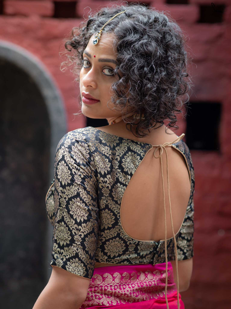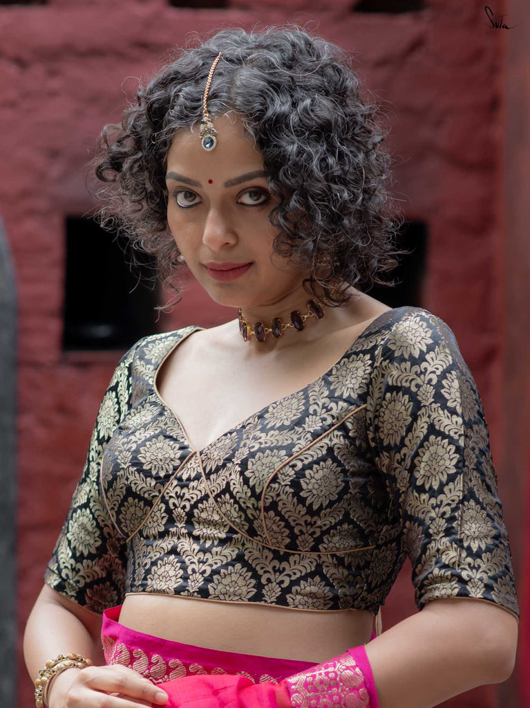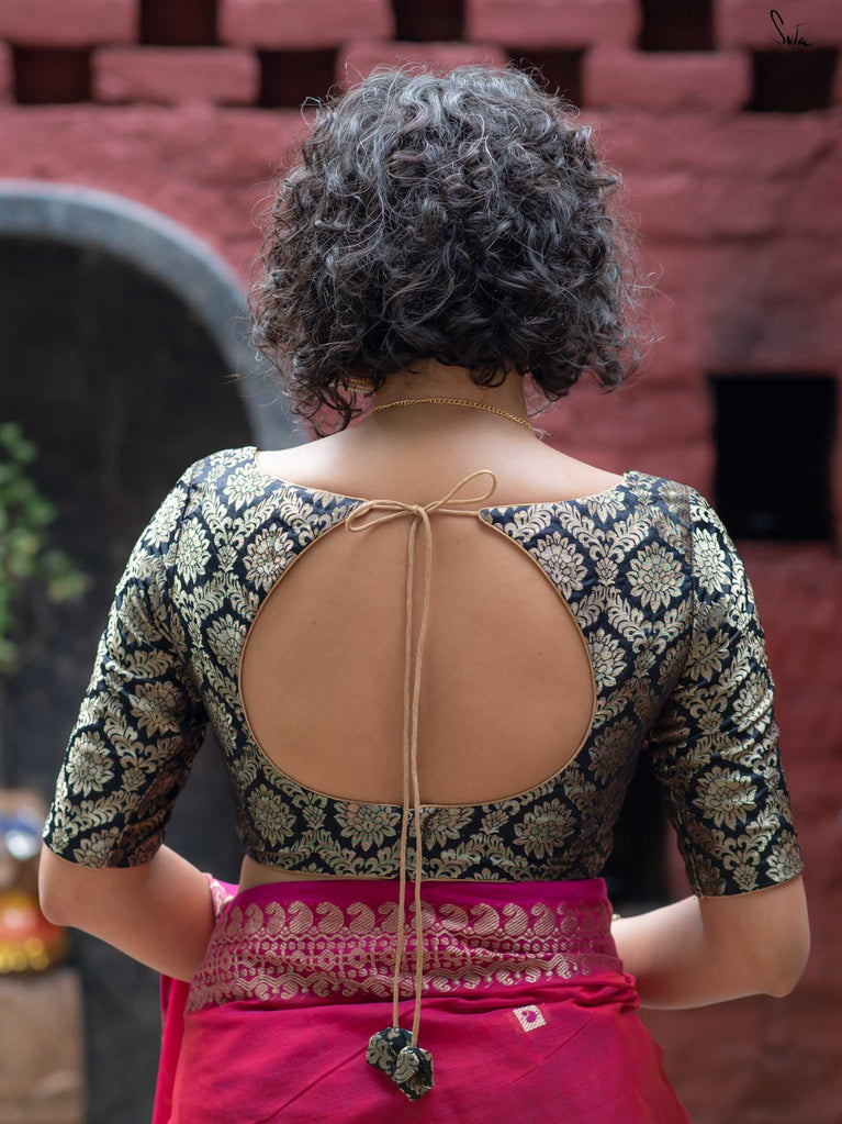 Gold meets black, bold and unforgettable. Sleeveless, padded blouse with an uber stylish square neckline. Back hook closure with tie-up adds the perfect finishing touch.