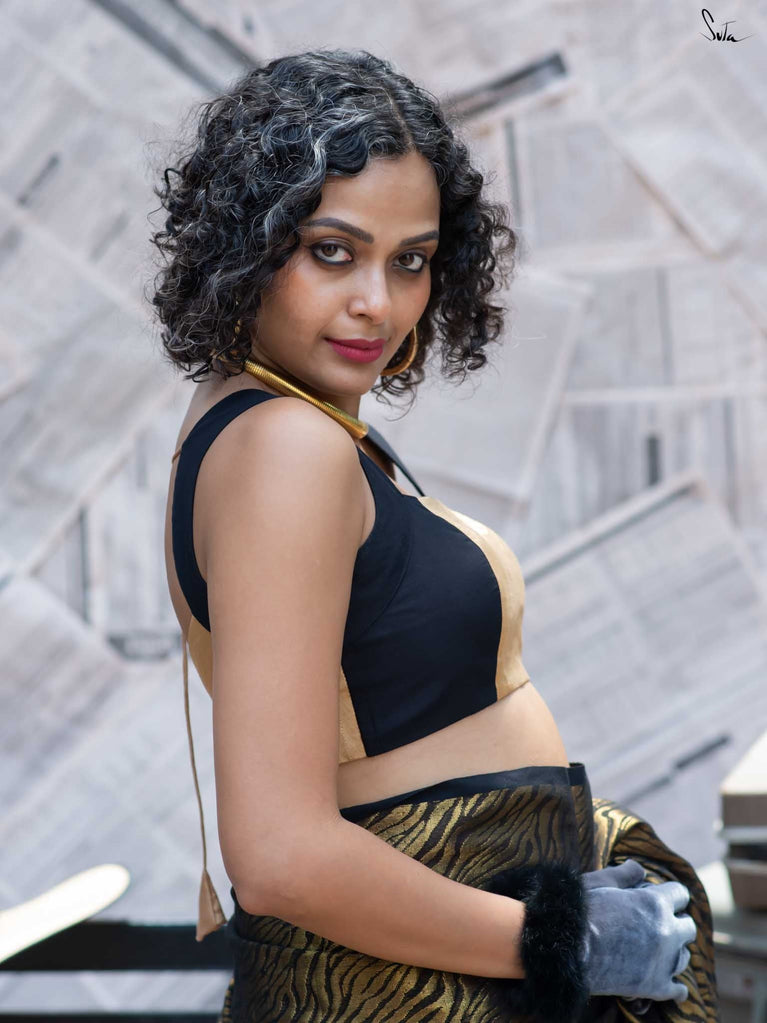 Su, the model is wearing size S blouse and the saree is Flying to the Moon Polka.