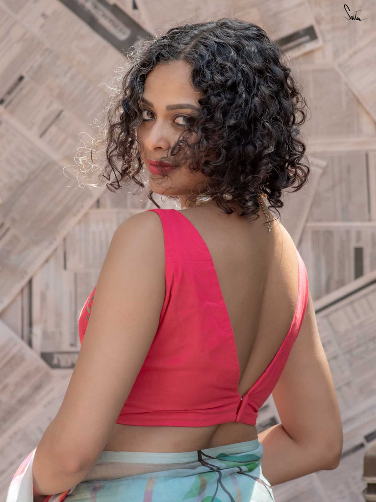 This pink floral cotton blouse hugs you just right, with a sleeveless cut that lets your confidence shine. V-neckline frames you beautifully, while the back hook closure keeps it sleek and chic.