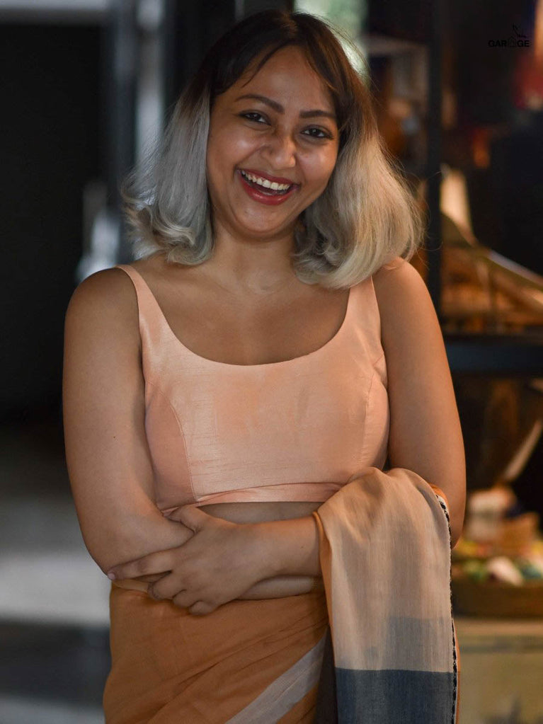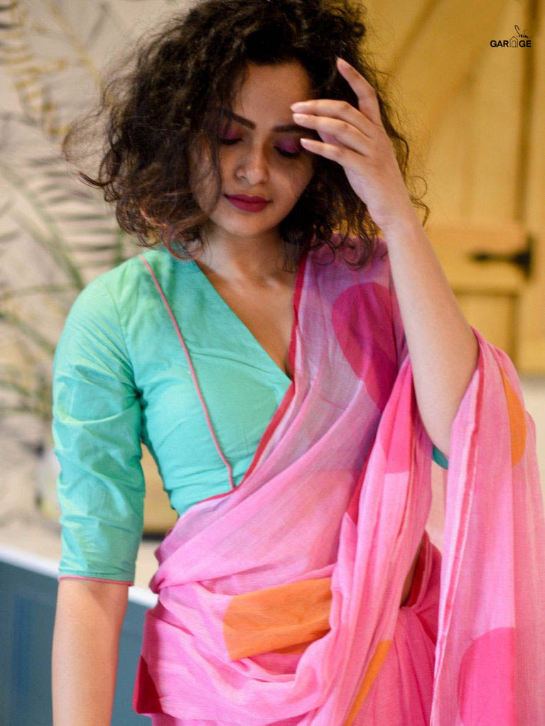 Su, the model is wearing size S blouse and the saree is Fireflies in the Garden Polka.