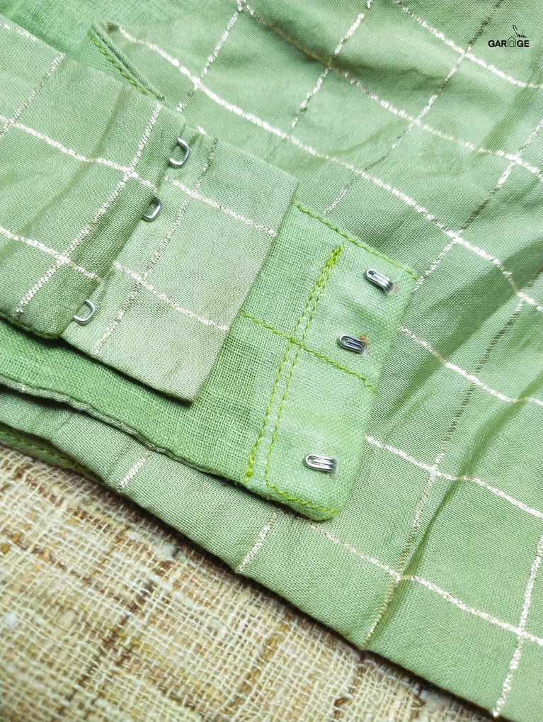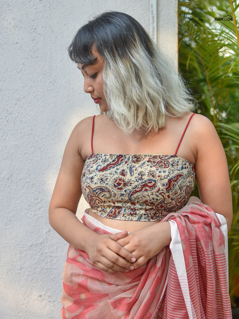 Cotton fabric dates back to some of the most ancient civilisations and it has a strong presence in the modern wardrobe as well. The incredible softness and lightness of cotton combined with its strength and versatility makes it one of the most popular choices, especially for the Indian climate. The comfort and the amazing feel that cotton offers in unparalleled! The fabric used for this blouse is a machine-embroidered cotton fabric which is also known as Hakoba cotton.The ruffle detailing on the blouse is made of organza fabric.Organza is a type of weave that creates light-weight, breathable, dreamy, translucent fabric that brings a certain ethereal charm to apparel. This weave also renders a characteristic stiffness, which beautifully comes together with the overall fluidity of the fabric. Organza can be made with different types of fibres. For this blouse, the organza weave is made of polyester.