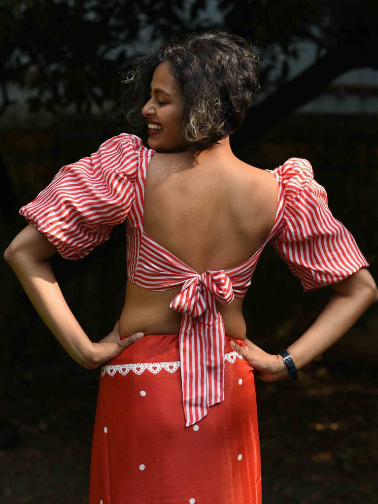 Su, the model is wearing size S blouse and the saree is Flying to the Moon Polka.