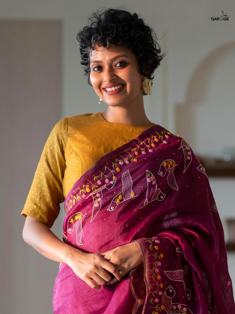The model is wearing size S blouse and the saree is Son Champa , Kand Pushp