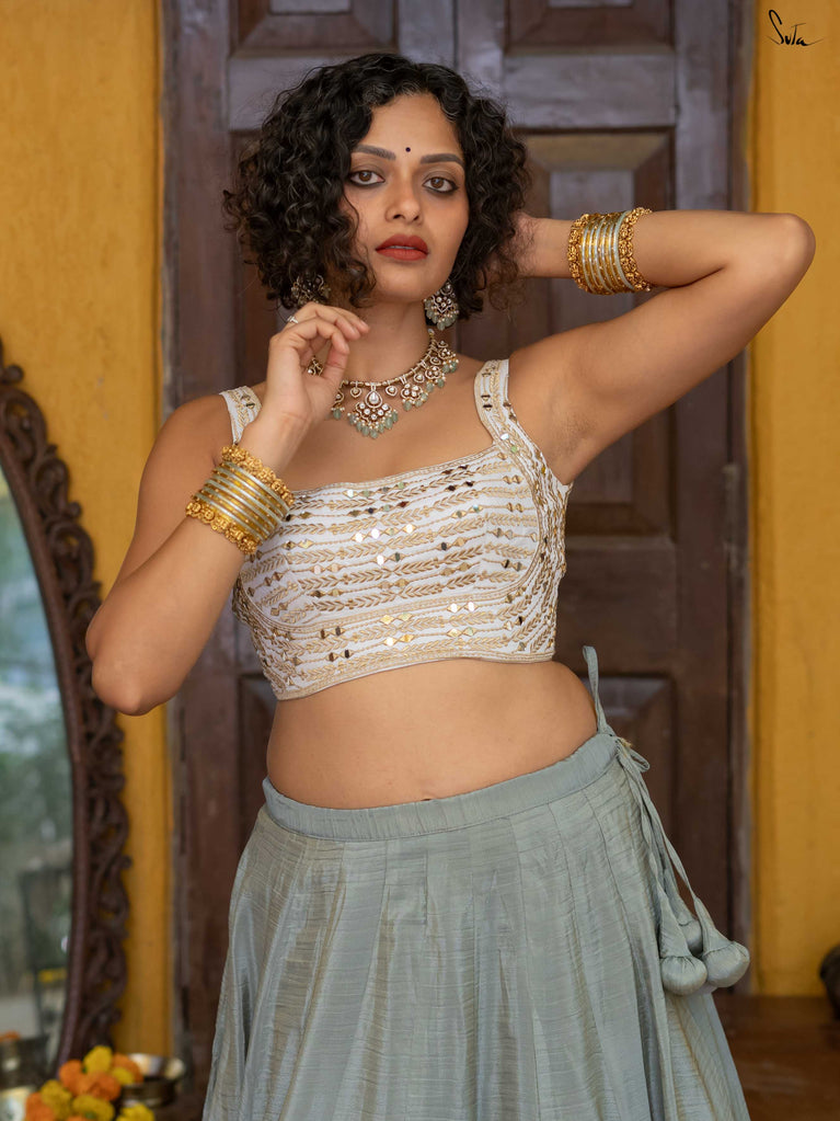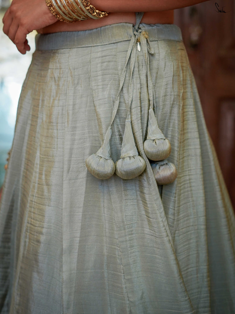 Mint green, light as a laugh shared mid-function. This crushed viscose lehenga is made for days that begin with “just getting ready” and end on the dance floor. The fabric has a soft festive sheen, fluid movement, and a roomy fall that lets you breathe, twirl, and sit cross-legged without a second thought. Finished with delicate scalloped gold lace and playful tassels, it brings just enough sparkle, never too much.Wear it with a blouse for the full festive look, drape it with a saree pallu, or style it as a skirt with your favourite crop top. Because when it’s bhai ki shaadi, comfort should still come first.