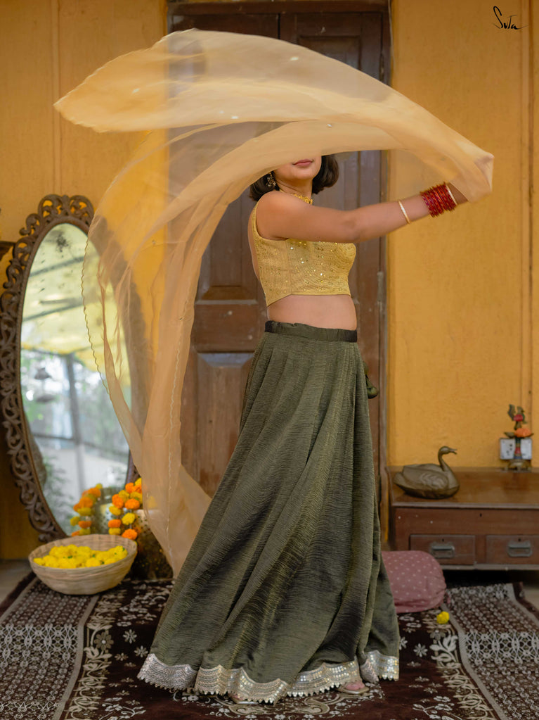 A rich green that feels festive without trying too hard. This crushed viscose lehenga is made for wedding days filled with movement, walking between functions, dancing when your song comes on, sitting wherever there’s space. Light, breathable, and fluid, it has a soft festive sheen that catches the light just right. Finished with scalloped gold lace and playful tassels, it brings in celebration without the weight. Style it with a blouse, drape it with a saree, or wear it as a skirt with your favourite crop top.Because when it’s chacha ki shaadi, comfort and fun go hand in hand.