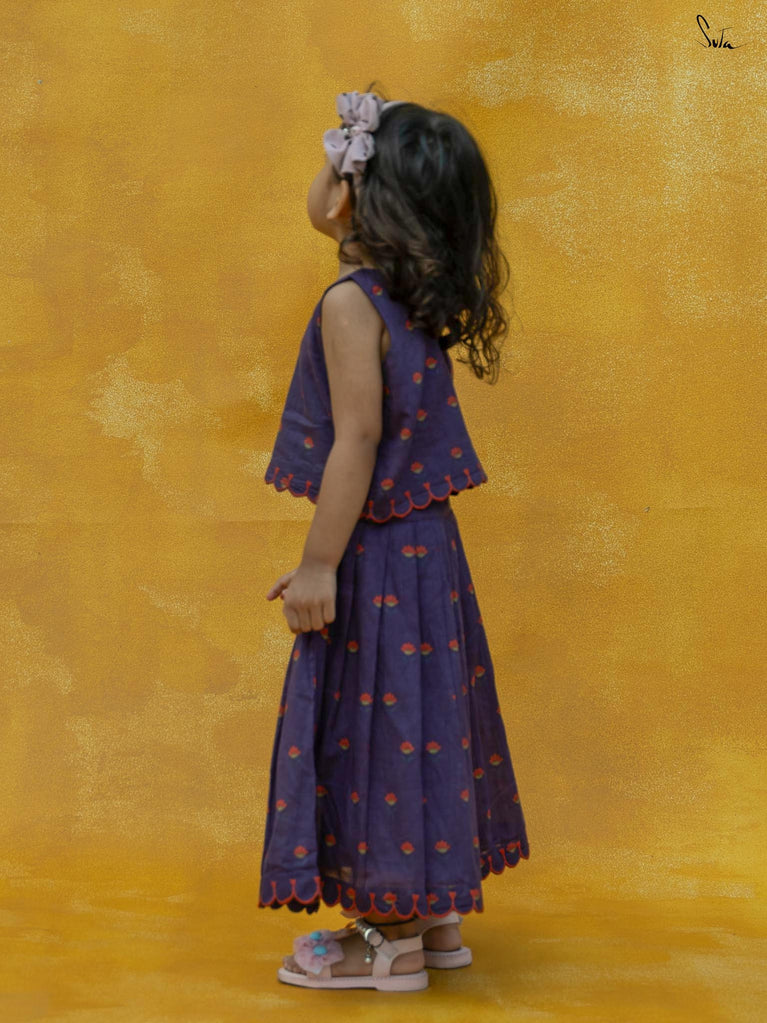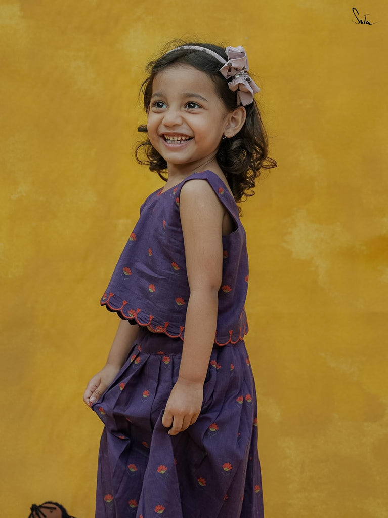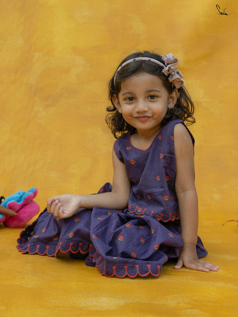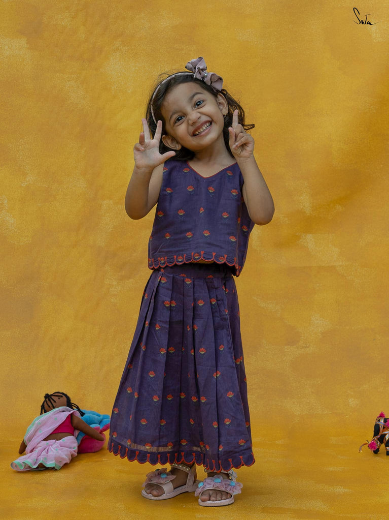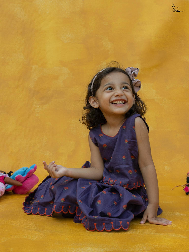 Adorn Chubby Cheeks like your delightful expressions while your child awestruck you with cuteness. The lehenga set in a rich purple floral print is beautifully crafted in cotton with scallop detailing. The outfit celebrates the joy of childhood, allowing your little one to twirl in style.