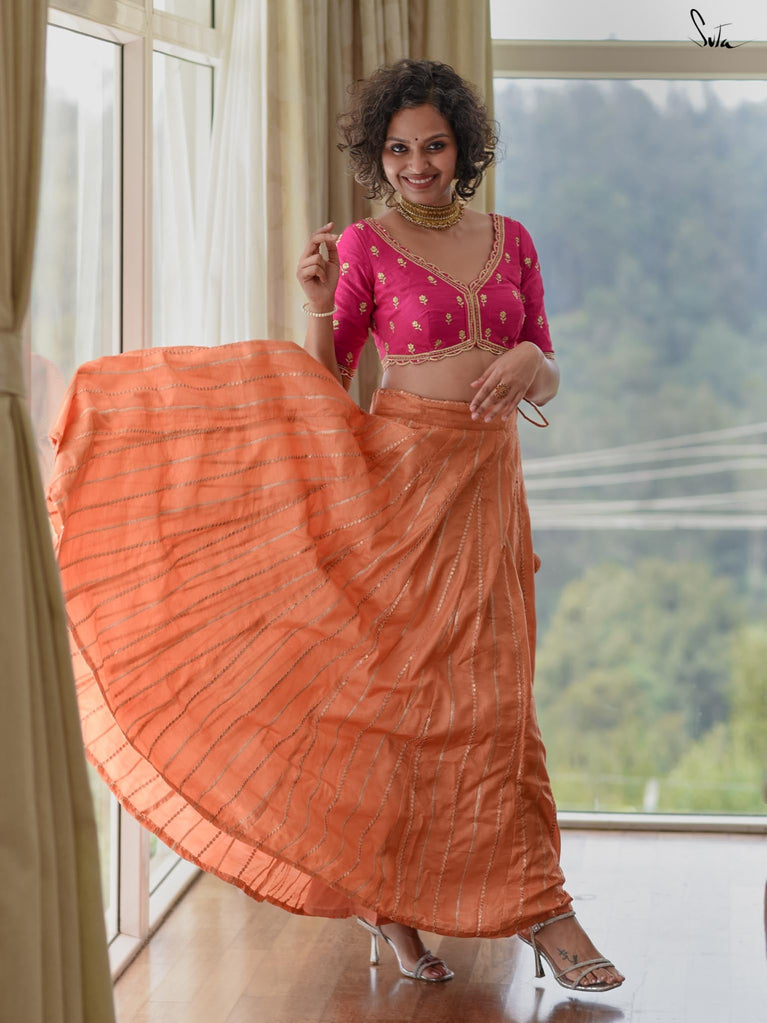 It was 5 am on a cold winter’s morning and Niharika was already wide awake. It was the first day of her wedding festivities. She was only hours away from being swept away by the hustle and bustle. But for now, her world was tranquil and calm. Her soulmate was her childhood sweetheart, with whom she had gone through many ups and downs. While she was happy, she could not help the nostalgia that washed over her, as she gazed out at the lawn, the big dahlias and the vibrant the rose bushes she had grown up amidst. In the horizon, dew drops sparkled on the leaves of the trees surrounding their house. And, as she stood there, the inevitability of change dawned on her. Today her life would change forever, but, for now, she would reminisce about the life she was leaving behind.Capture your most beautiful memories in this gorgeous art silk lehenga.