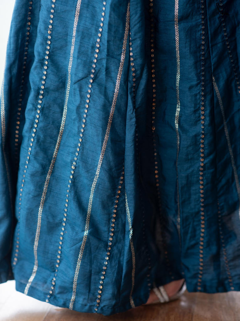 Chanderi is a luxurious but lightweight fabric. Silk, cotton and zari are woven together on the warp and weft in various combinations to create different textures – the resultant fabric is visually stunning and feels exceptionally comfortable. It is no surprise then that this fabric was favoured by royalty and continues to be a hot favourite, especially for the festive season. The fabric used for this blouse is a handloom weave. The process is time and labour intensive, but adds an inimitable beauty to the fabric. Choosing handloom products enables us to support smaller weavers while keeping alive our country’s rich weaving heritage.