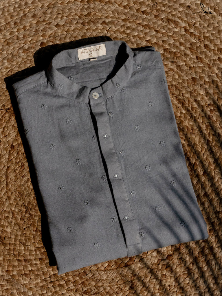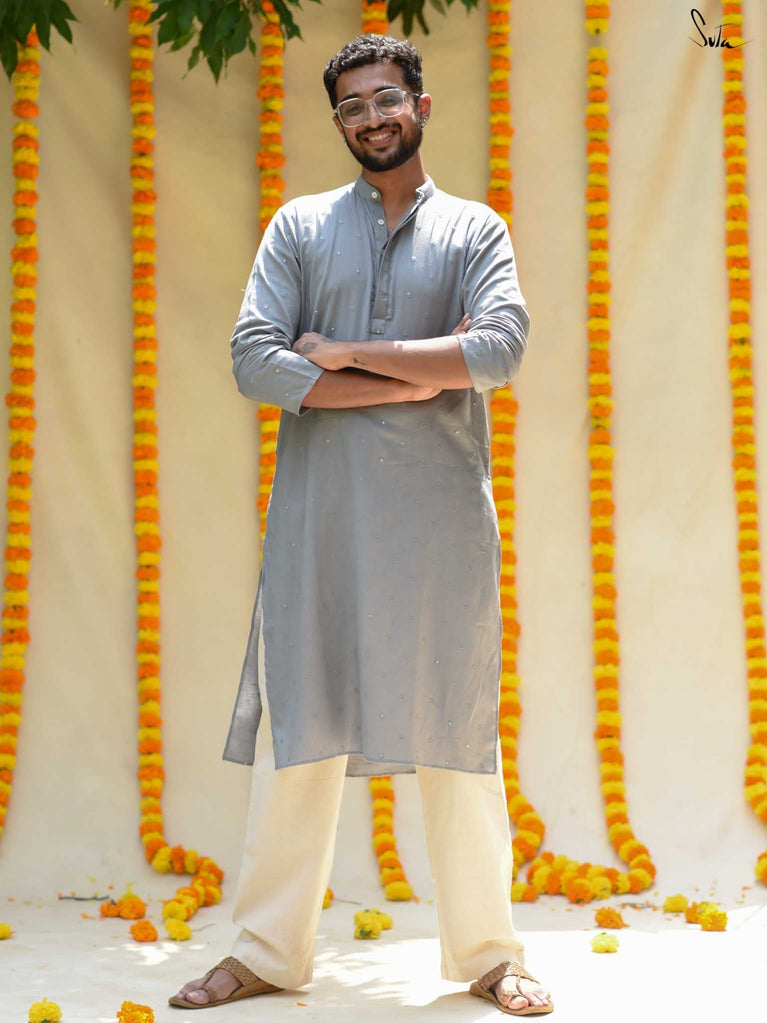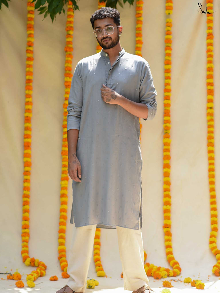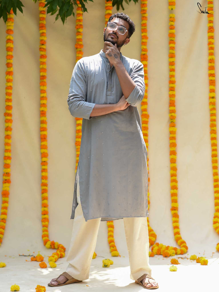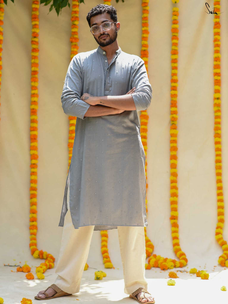 The Ash Ki Raat Kurta captures the allure of evening celebrations. In a graceful shade of grey, this cotton kurta boasts delicate tone-on-tone flower butta and shimmering sequins. Its understated elegance is ideal for festive gatherings, allowing you to celebrate the warmth of togetherness in effortless style.