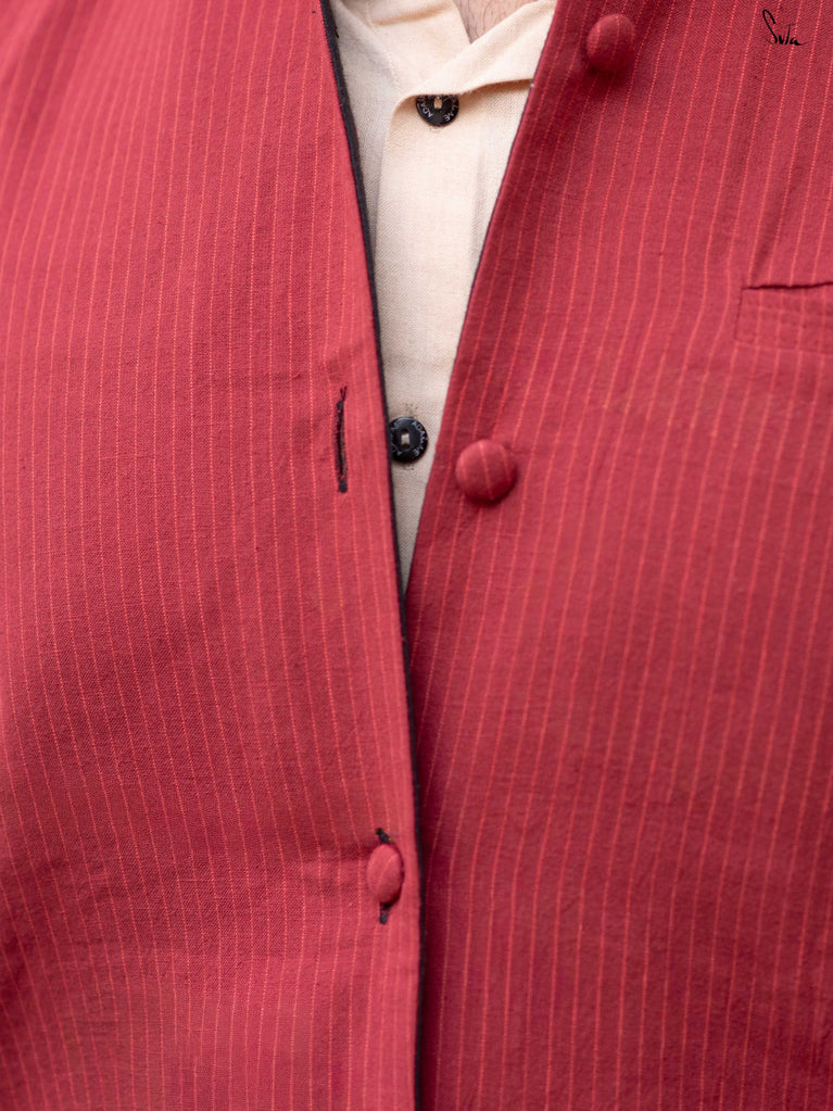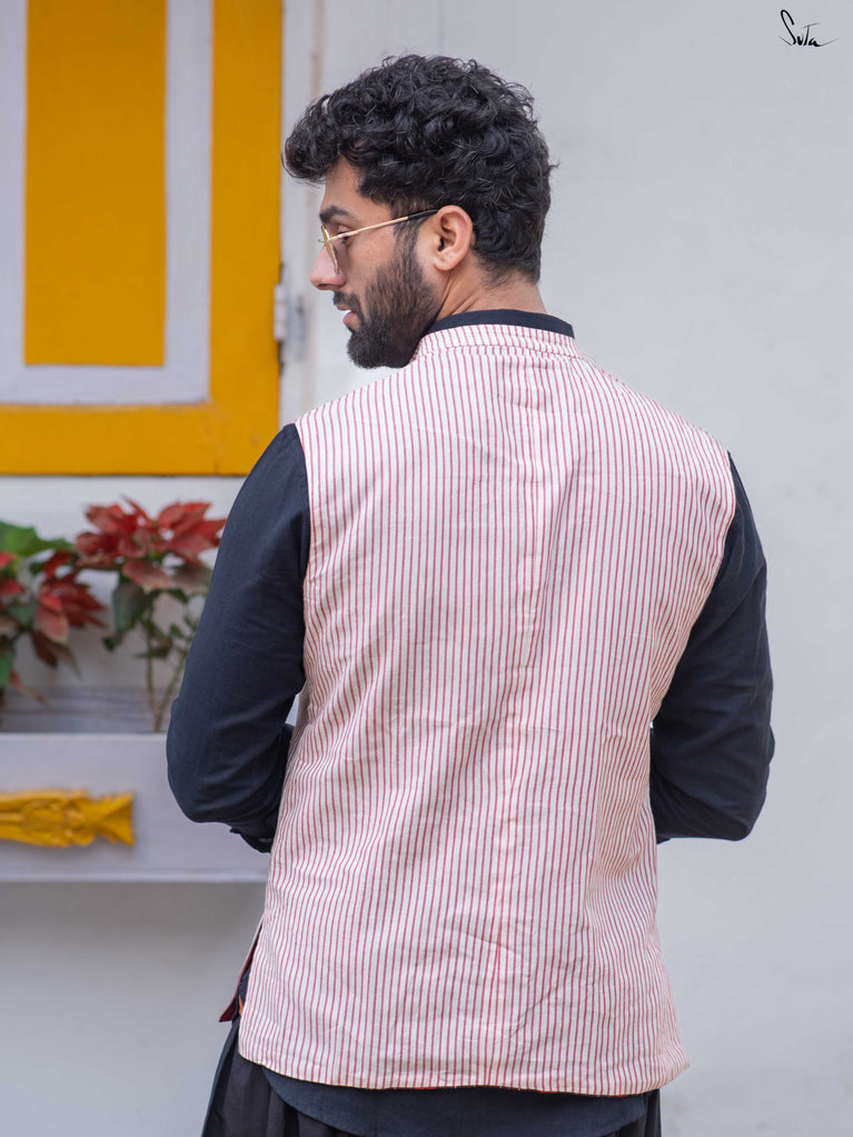 Sleeveless, finished with a Chinese collar and practical pockets, this waistcoat styles effortlessly over kurtas, shirts, or dresses. From work hours to late dinners, it adapts - no second thoughts needed. Two sides. One jacket. Pure energy.