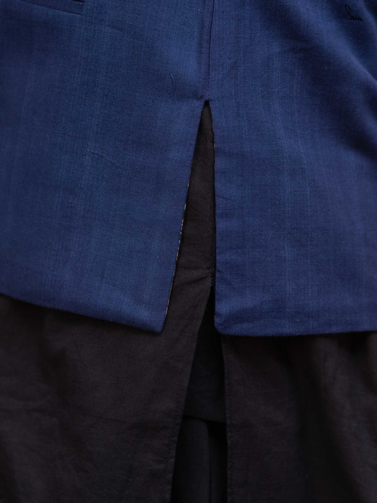 Sleeveless with a clean Chinese collar and functional pockets, this waistcoat moves smoothly from work hours to coffee breaks to evening plans. Style it over kurtas, shirts, or dresses - buttoned up, worn open, or turned around. Two sides. One moment. A jacket that keeps up.