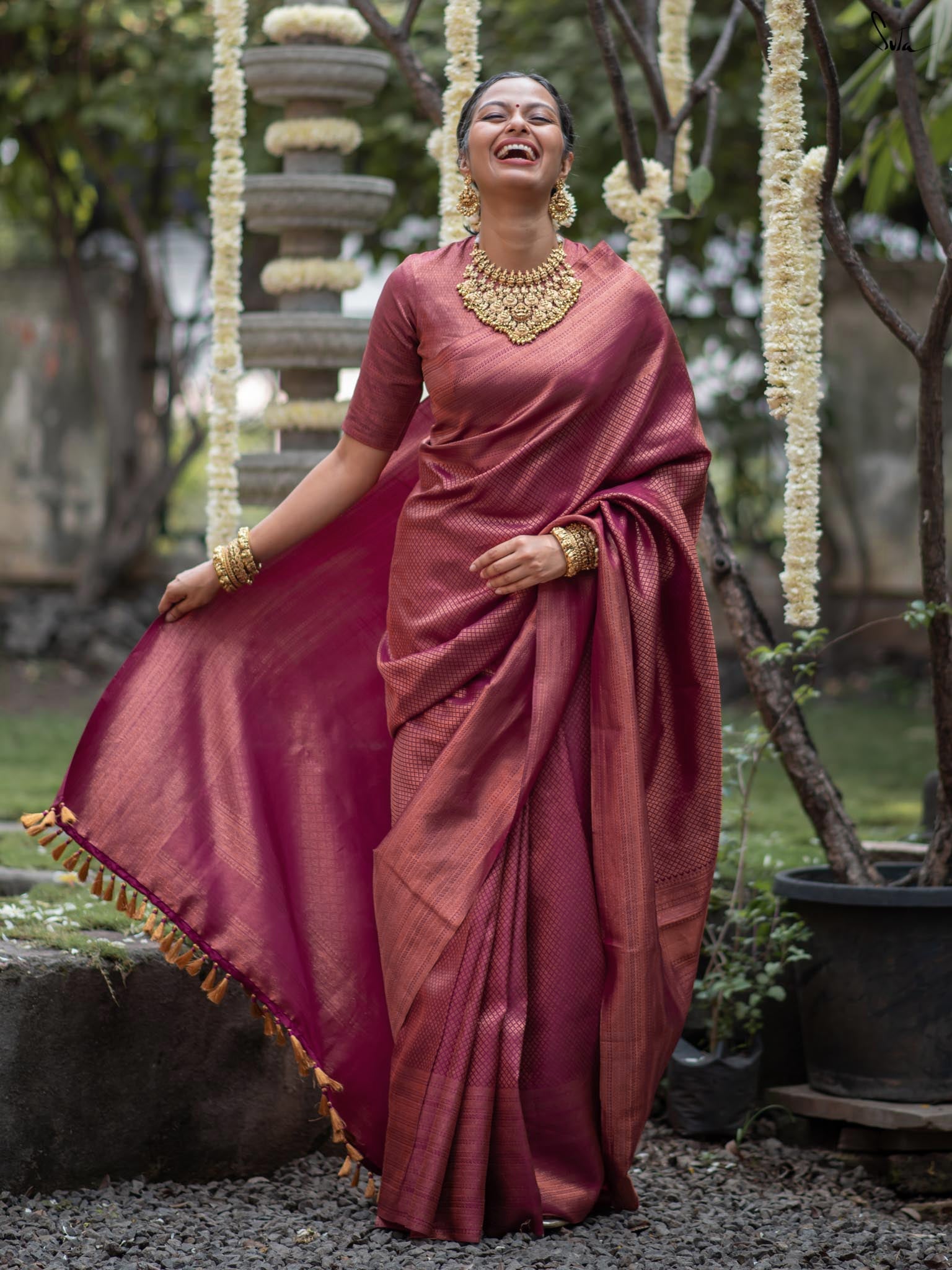 Anvika, a 100% silk Kanjivaram in pink unfolds like the delicate petals of festive blooms. Its intricate zari work and metallic tassels reflect the beauty of nature’s simplicity. Perfect for creating memories and embracing joy, it comes with a matching blouse piece for a complete, radiant look.