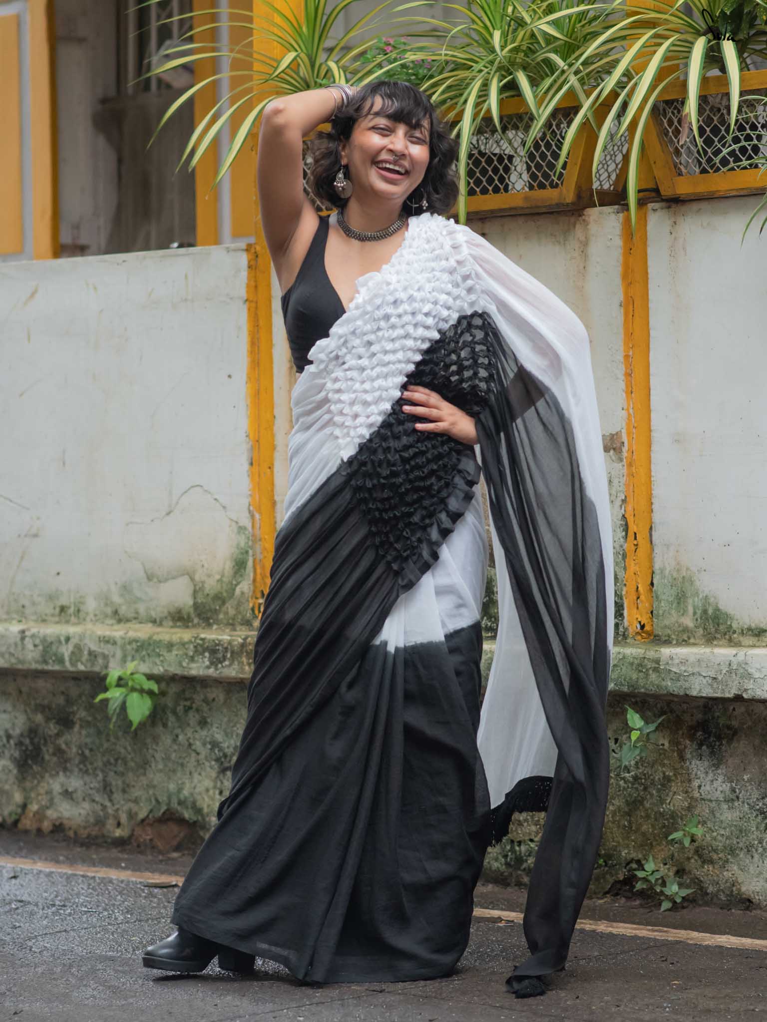 Classic yet full of contrast, this black and white ombre mul cotton saree is elegance reimagined. The tie-dye shifts from inky depth to soft ivory, echoing shadows melting into light. Shadow-toned smocking adds dimension, while monochrome tassels lend it a crisp finish. It’s a saree that speaks in silences and stands out in a crowd with quiet power in every thread.