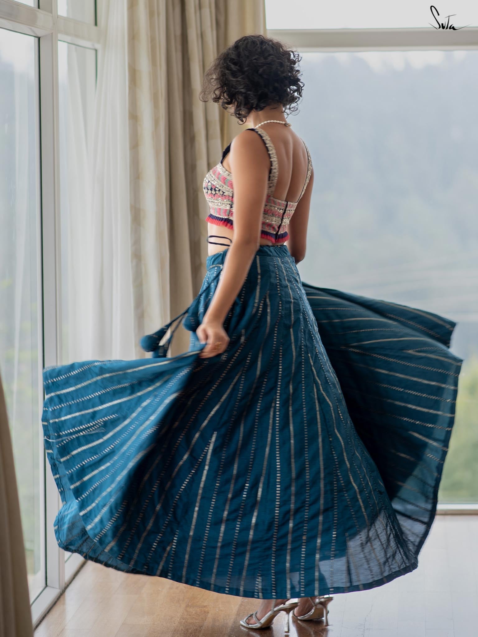Uncover your hidden glam with the 'Damini Rekha' lehenga, an exquisite machine-embroidered masterpiece, featuring a stunning navy blue hue. This art silk lehenga also features a side zip and knot opening, making your inner style shine through every outing!