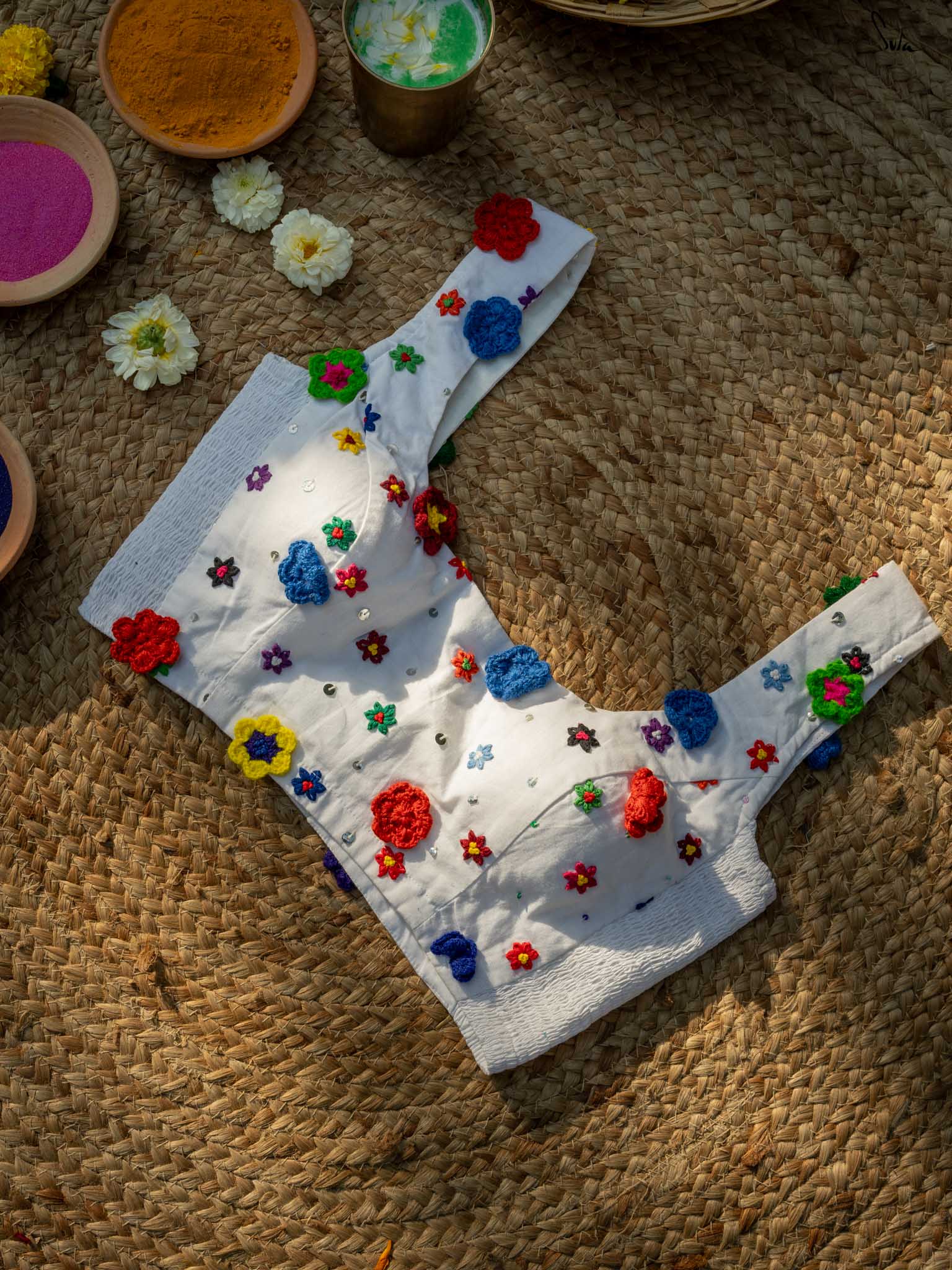 This white sleeveless cotton blouse is a floral fantasy, woven with the delicate magic of 3D crochet flowers. A symbol of blossoming joy, it hugs your body with the comfort of Elas-Tech, adapting to your shape like the festival itself, full of surprises. The 3-inch elastic shirring on both sides allows this blouse to stretch and move with you, providing both style and flexibility. The softback hook opening and U-neckline create a graceful, flattering fit, while the vibrant flowers dance like colors in the air. Wear it, and let the celebration begin. Shop one size below as it expands to fit your shape beautifully.