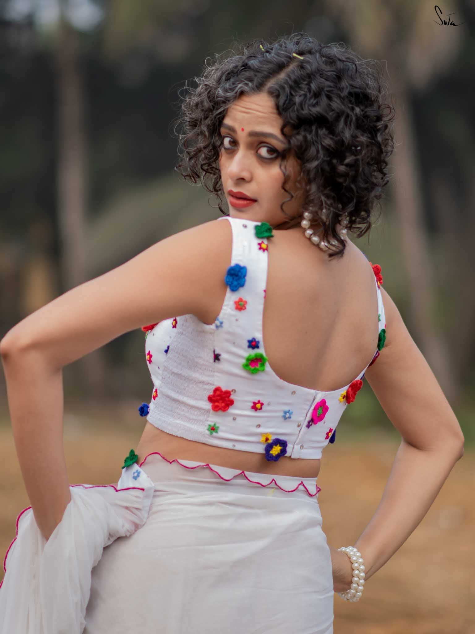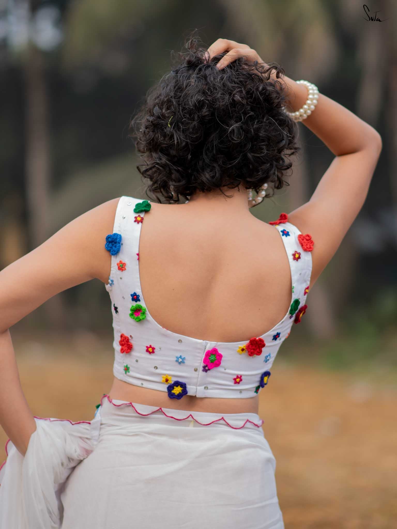 The model is wearing size S blouse and the saree is Dipped in Flowers