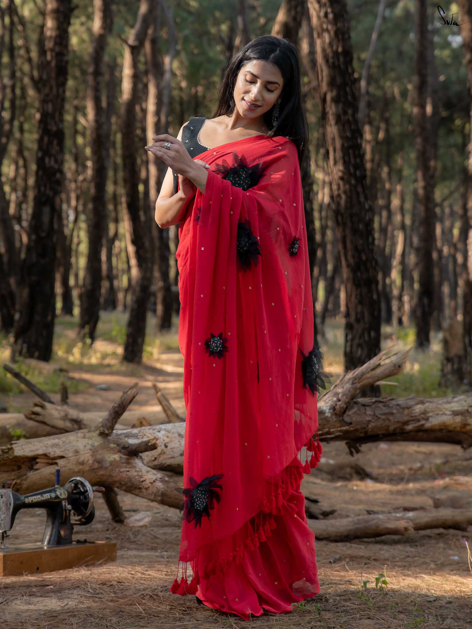 This saree is a burst of warmth woven into the softest mul cotton. The fiery red base feels like a sunset you can wear - light, breathable and oh-so-comforting against the skin.