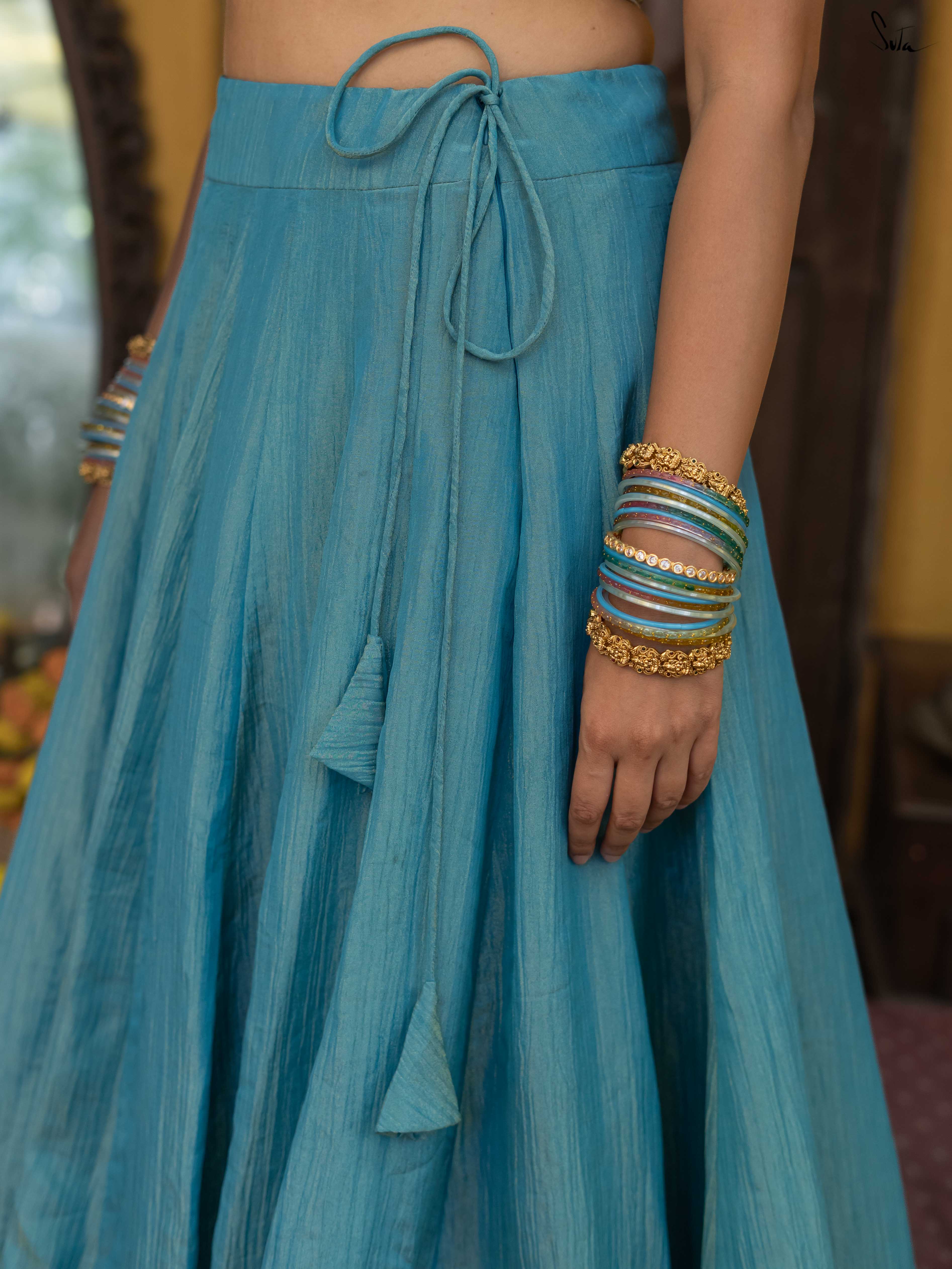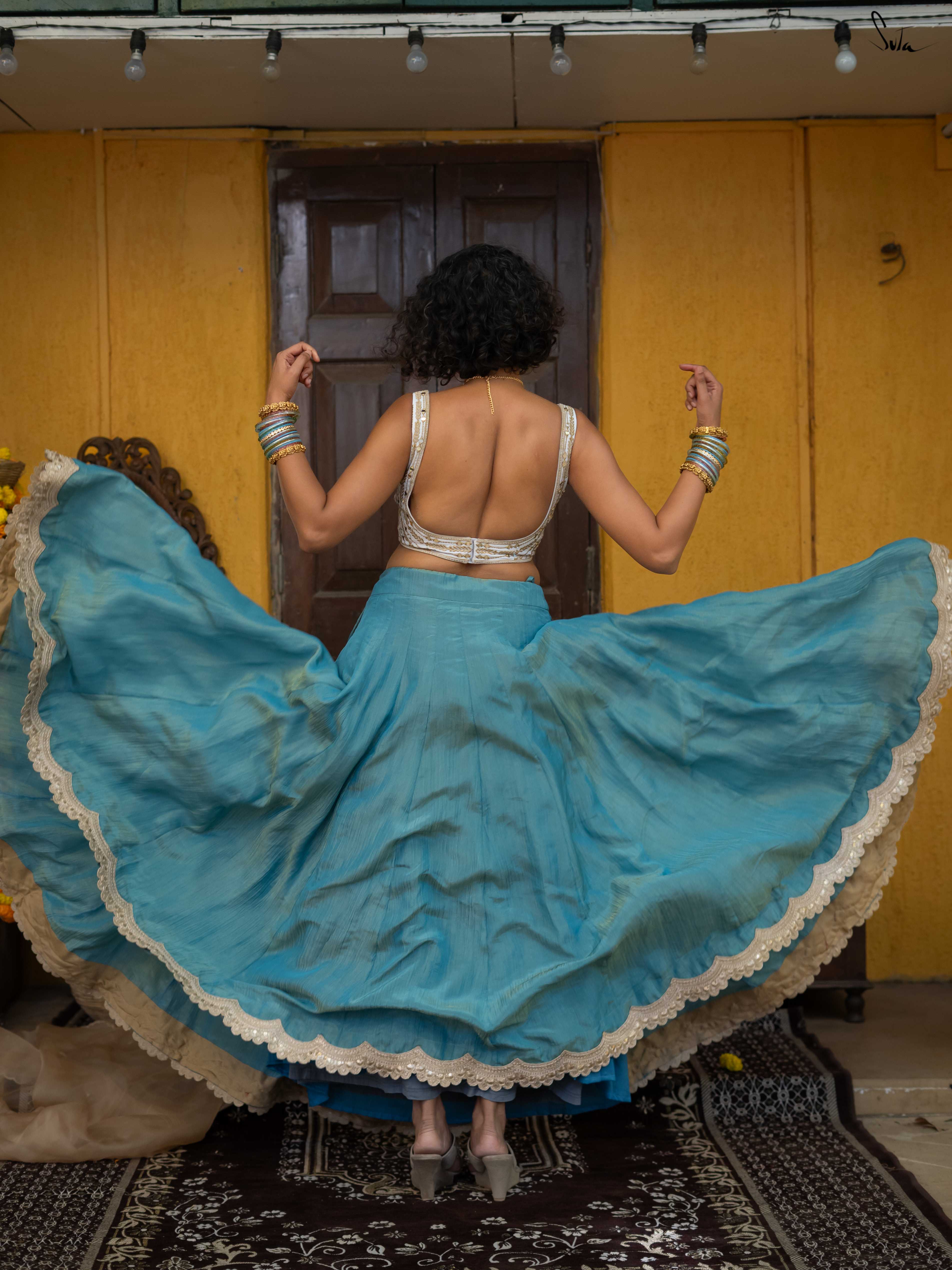 A bold blue for showing up unbothered and looking great doing it. This crushed viscose lehenga is made for celebrations where comfort is your power move. Light, fluid, and softly festive, it moves with you, whether you’re dancing, laughing, or just living your best life. Scalloped gold lace adds a hint of glow, while tassels keep it playful and fun.