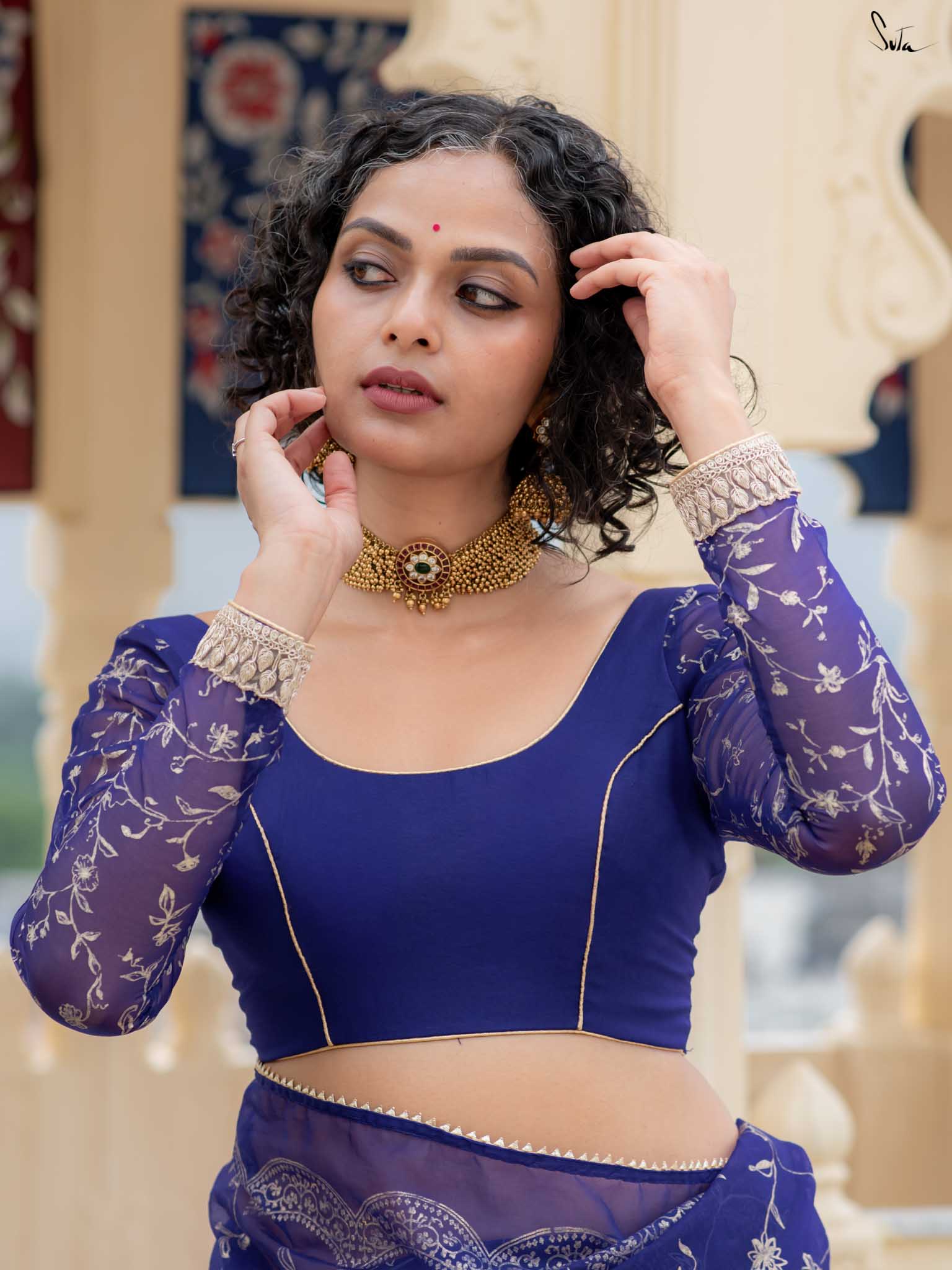 Bring sparkle to your festive and wedding looks with Frozen Twist, a full-sleeve blouse in rich purple foil organza. Sheer sleeves paired with a flattering U-neckline and delicate lace detailing at the cuffs make this blouse perfect for twirling through celebrations.