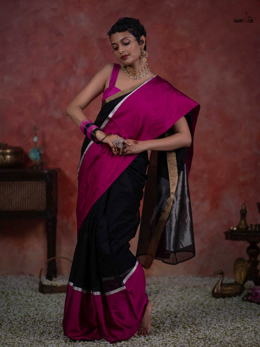 This saree has been handwoven by a master weaver in the Mashru tradition. The Mashru weave is said to have originated in West Asia, in the 19th Century. The fabric is woven with a silk weft and a fine cotton warp. It thus combines the ageless comfort of cotton and the timeless aesthetic of silk, elevated by the presence of gold and silver zari.