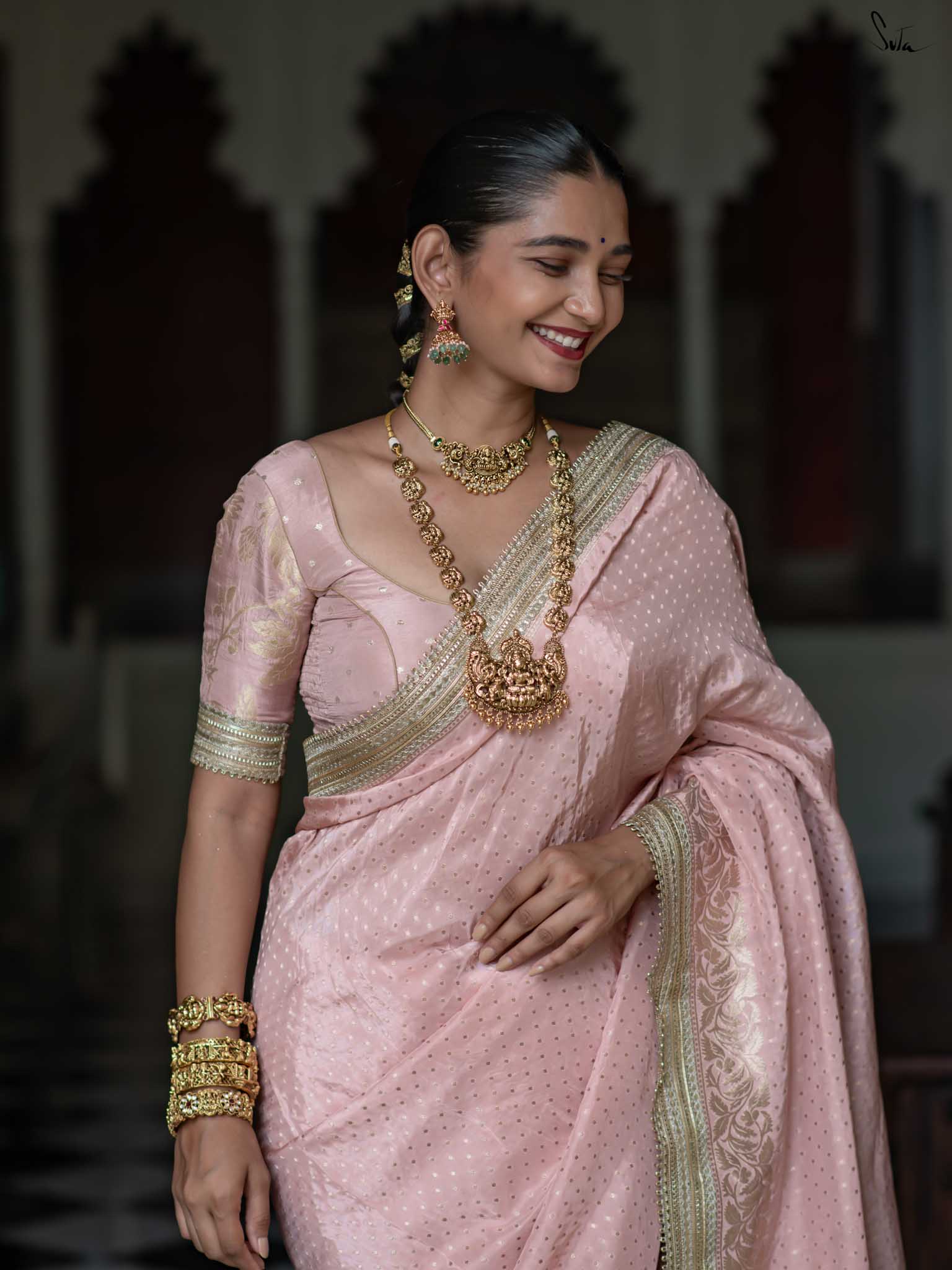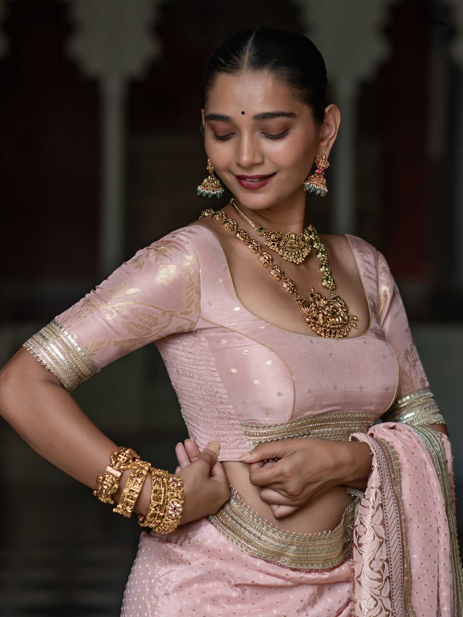 Soft peach with a celebratory glow, Ghewar Hai is designed with a front round neck and elbow-length sleeves. The polka and floral jaal fabric, finished with embroidered lace, makes this blouse an effortless blend of comfort and elegance.