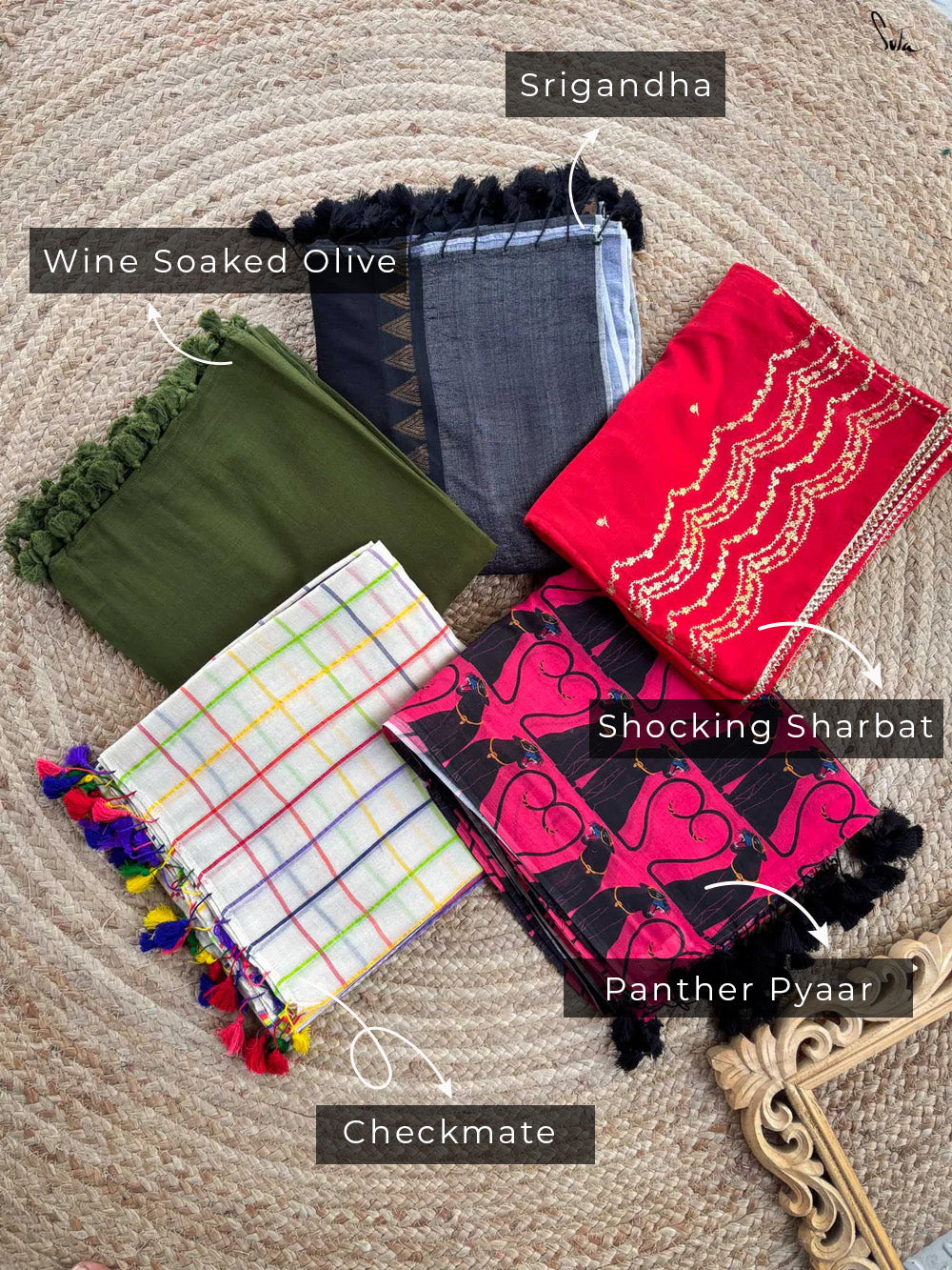 Wrap yourself in luxury with our majestic "Golden Aura" saree combo! This regal collection of 5 sarees, crafted from a diverse range of fabrics, exudes a charming aura that's sure to elevate your style. Every drape will make you feel like royalty, as the intricate designs and majestic colors transport you to a world of elegance and sophistication.
