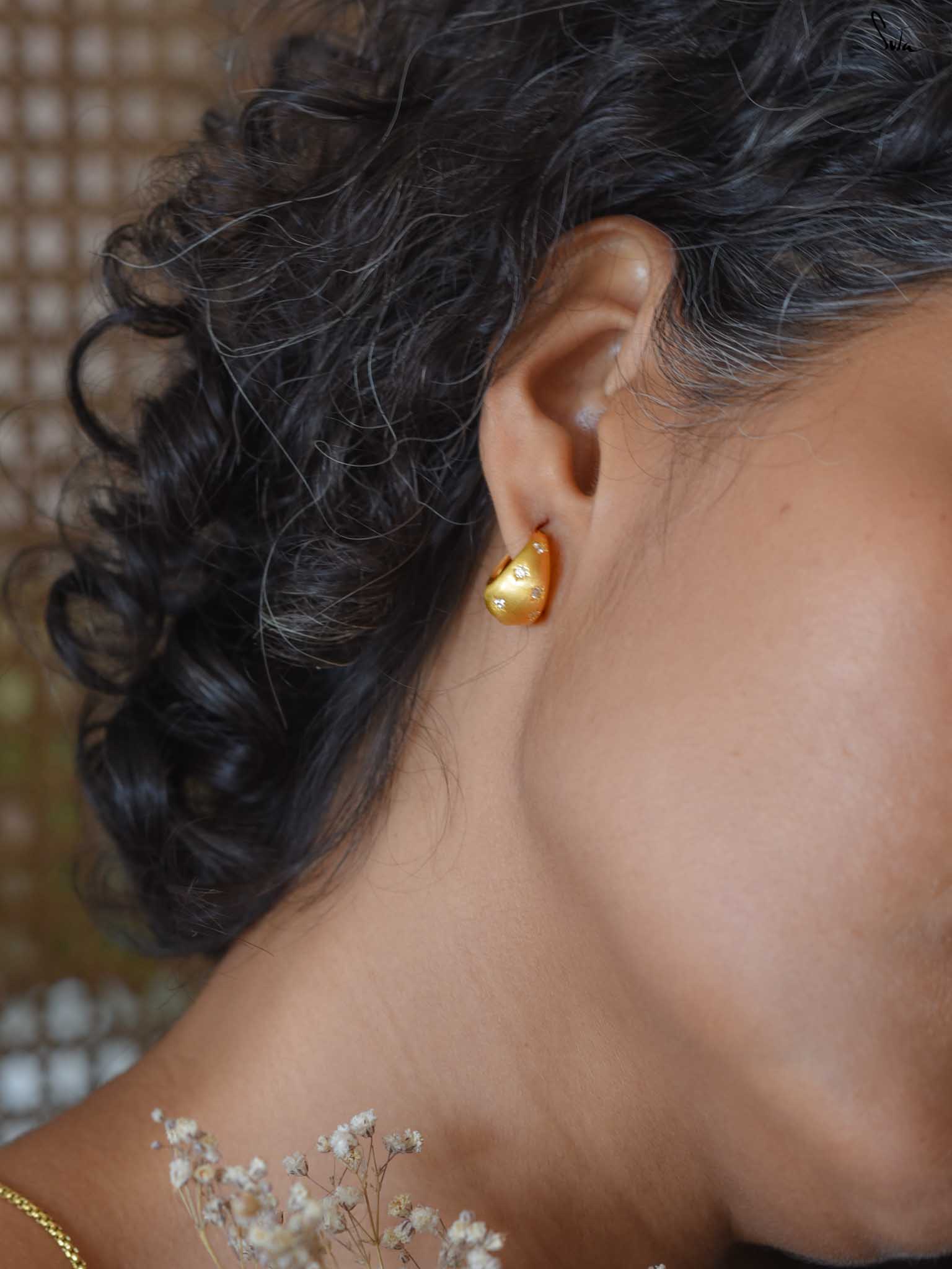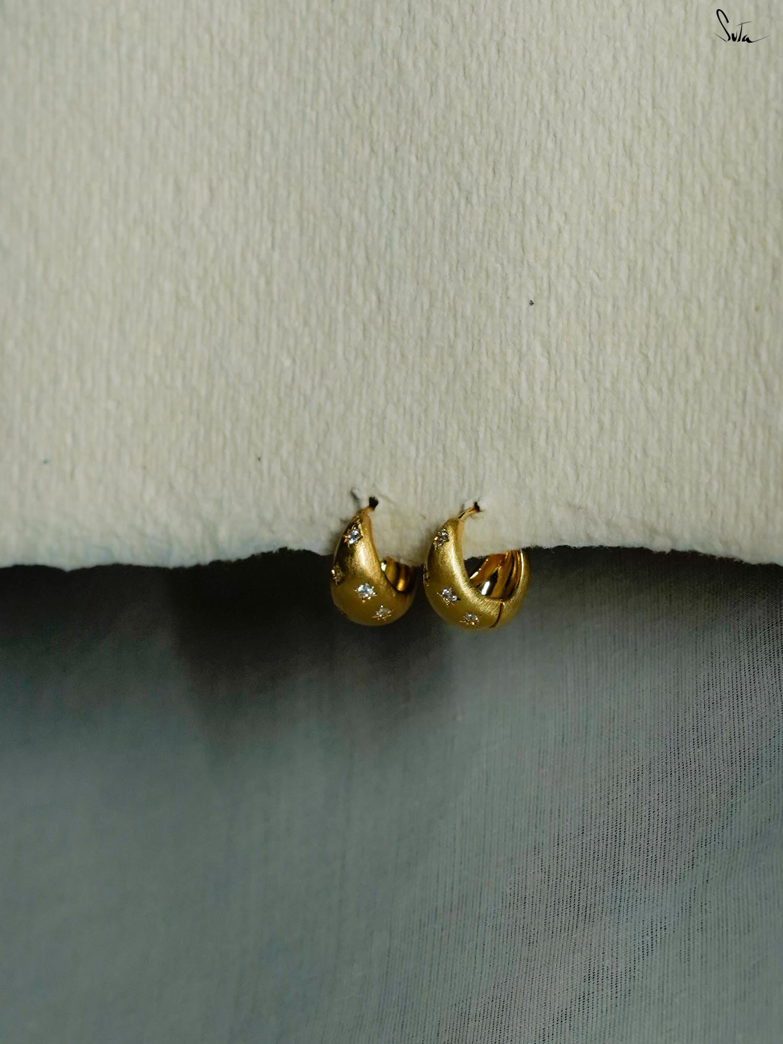 Micro-gold hoops in sterling silver, studded with AD stones. Inspired by a warm hug, gold-tinted and cozy. Feels like a good day.