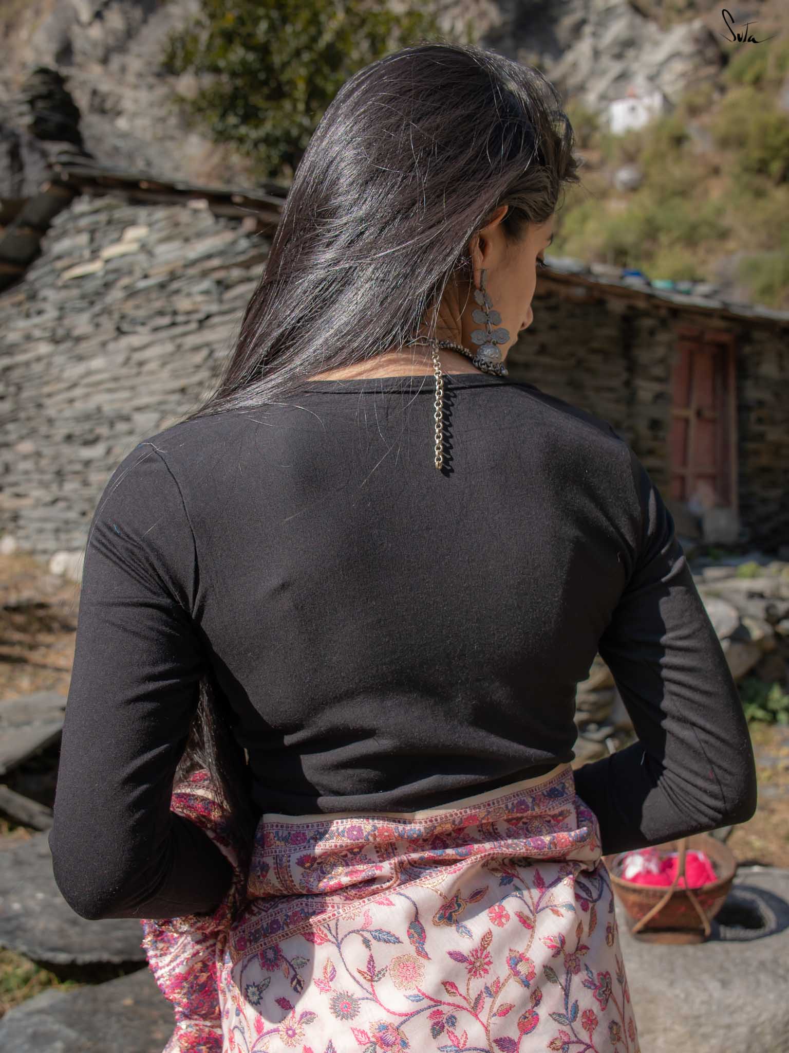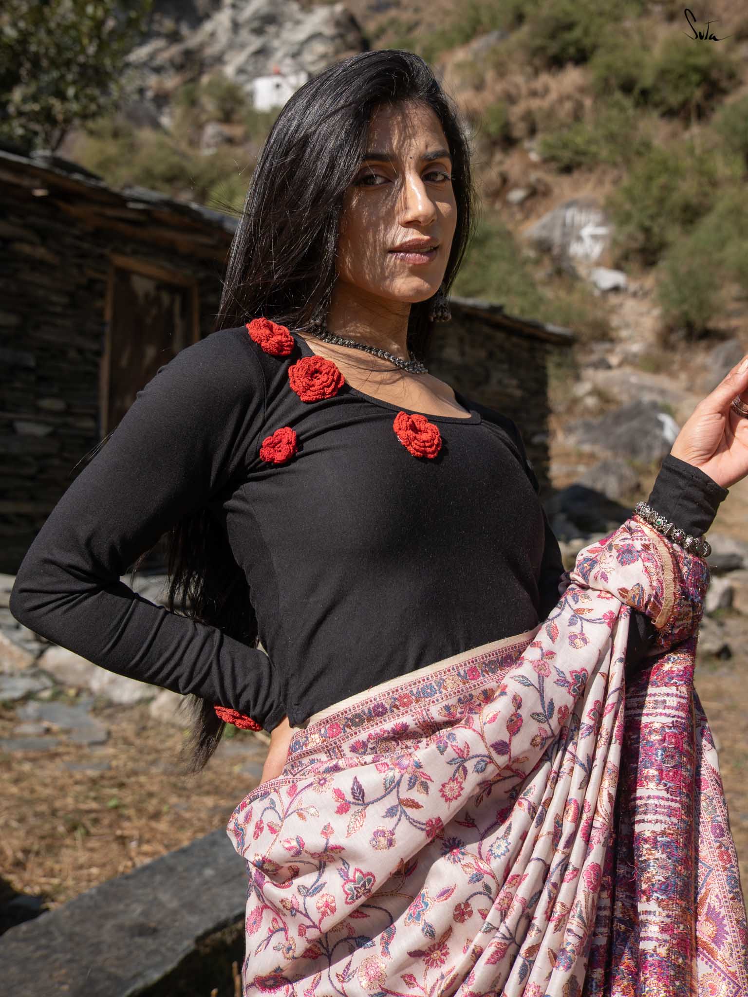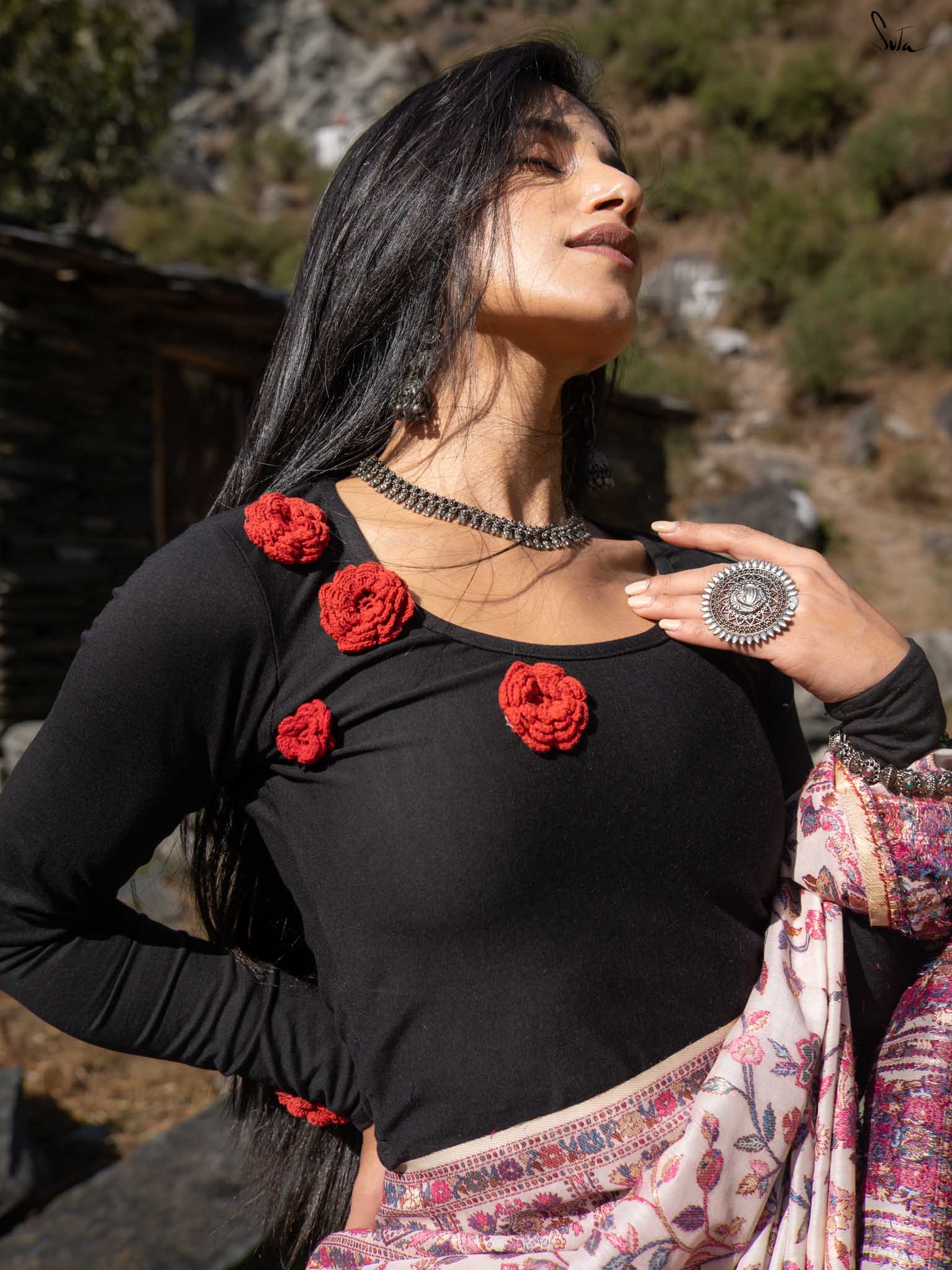 The round neckline and full sleeves give it timeless grace, while delicate crochet flower embellishments on the neck and cuffs add a handcrafted touch of beauty. Elegant yet effortless, it pairs seamlessly with sarees, skirts, or even trousers, your go-to for style that feels like second skin.