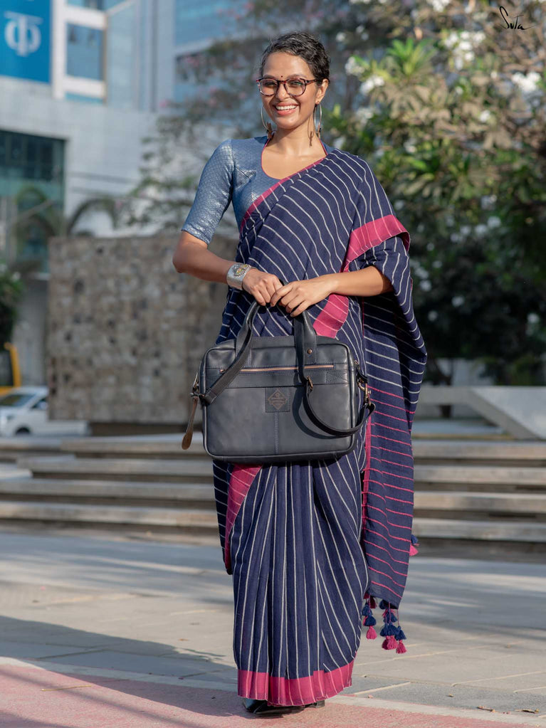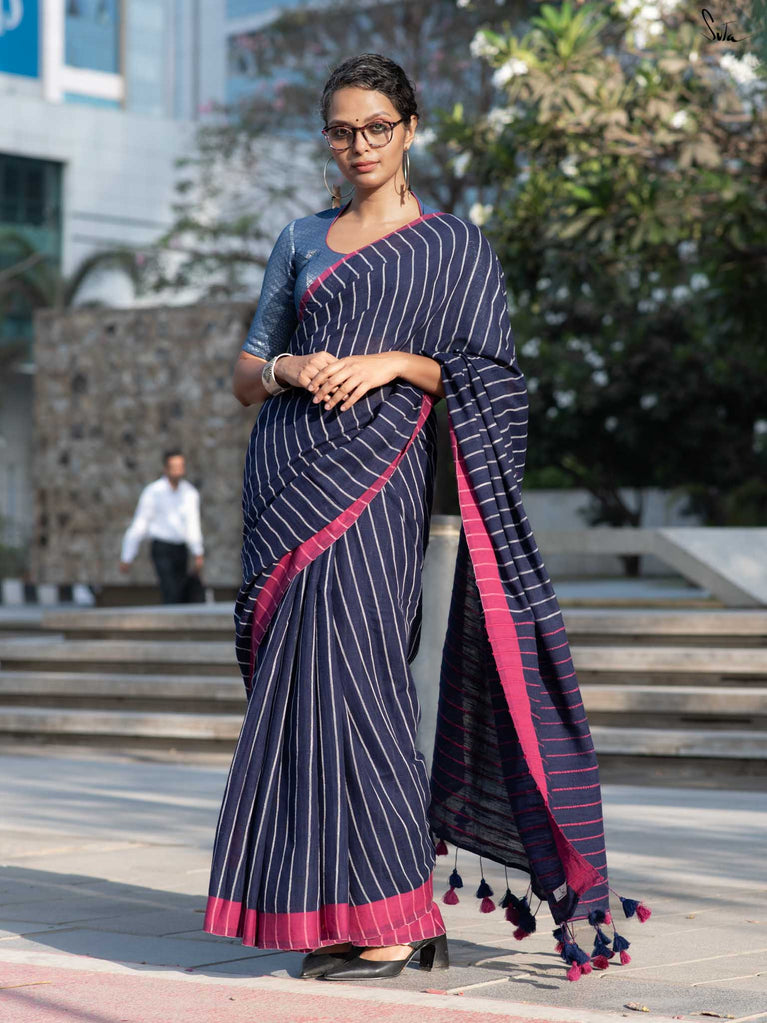 You’re the moon; soft, glowing, impossible to ignore. Inspired by this thought, we designed something that reflects you. This grey mul cotton saree feels peaceful and grounding, like a quiet moment to yourself. The zari-lined border adds just the right amount of shine, while the magenta-accented pallu brings in a soft pop of brightness. The contrast of grey and magenta tassels ties it all together with thoughtful detail. It’s perfect for slow festive mornings, quiet rooftop evenings, or cozy, intimate gatherings.