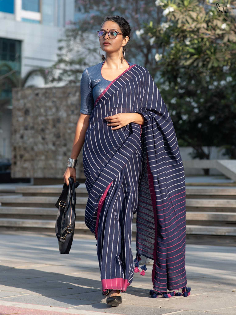 Like silver linings- bright and hopeful, this light blue mul cotton saree is all about easy elegance. The contrast selvedge adds a touch of character, and the zari lines on the pallu catch the light most softly. A pop of lime green and matching tassels bring in a fresh, summery surprise. Perfect for daytime events, office parties, or lunches that turn into laughter-filled afternoons.