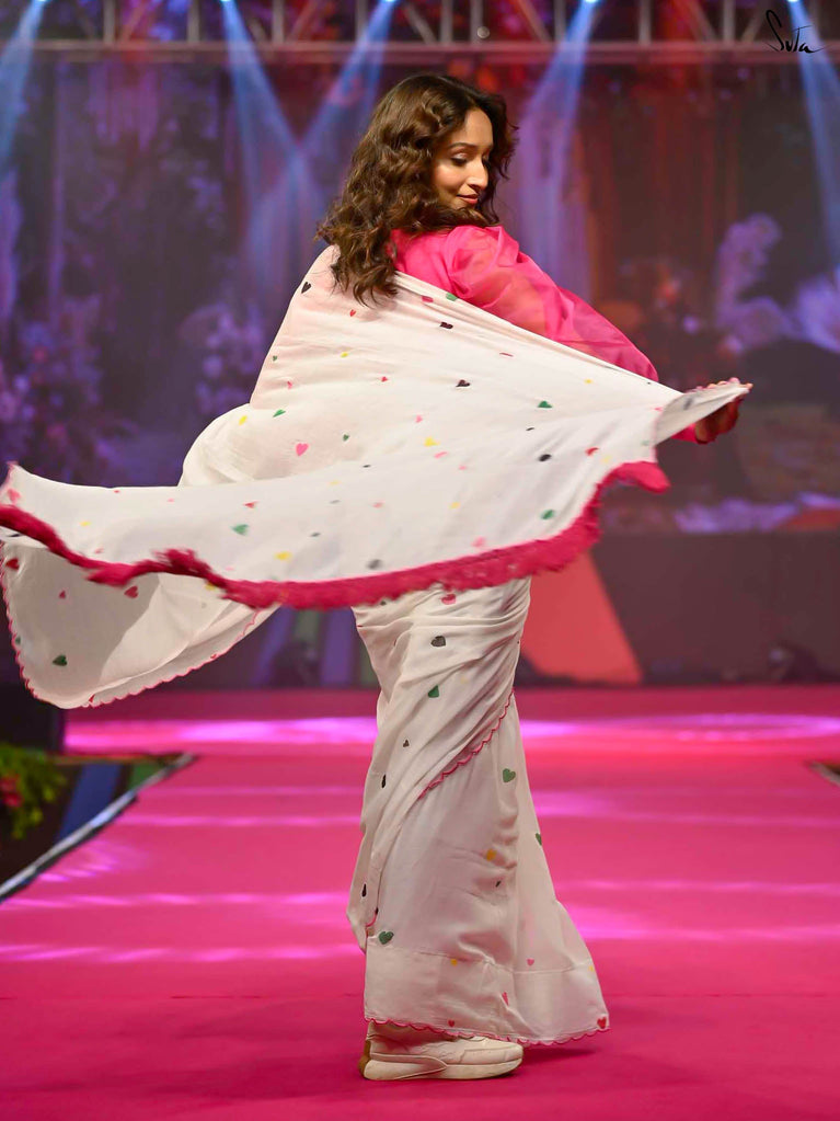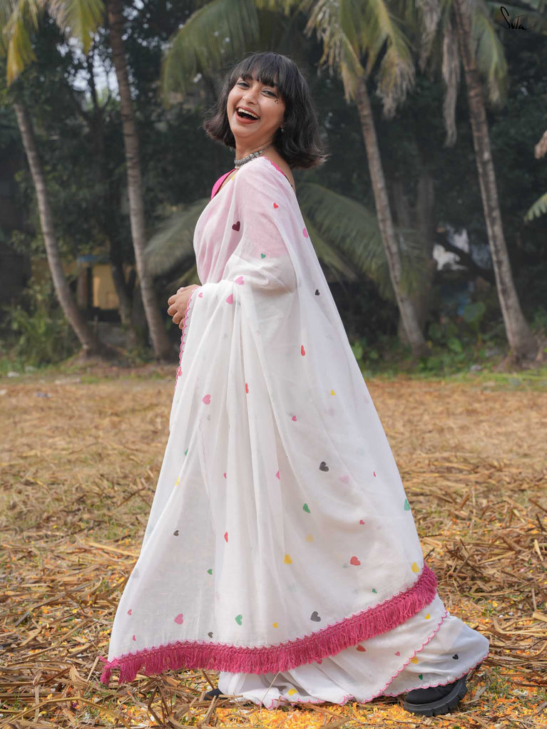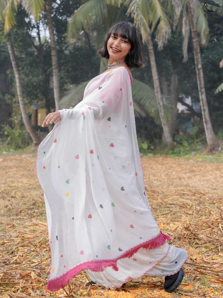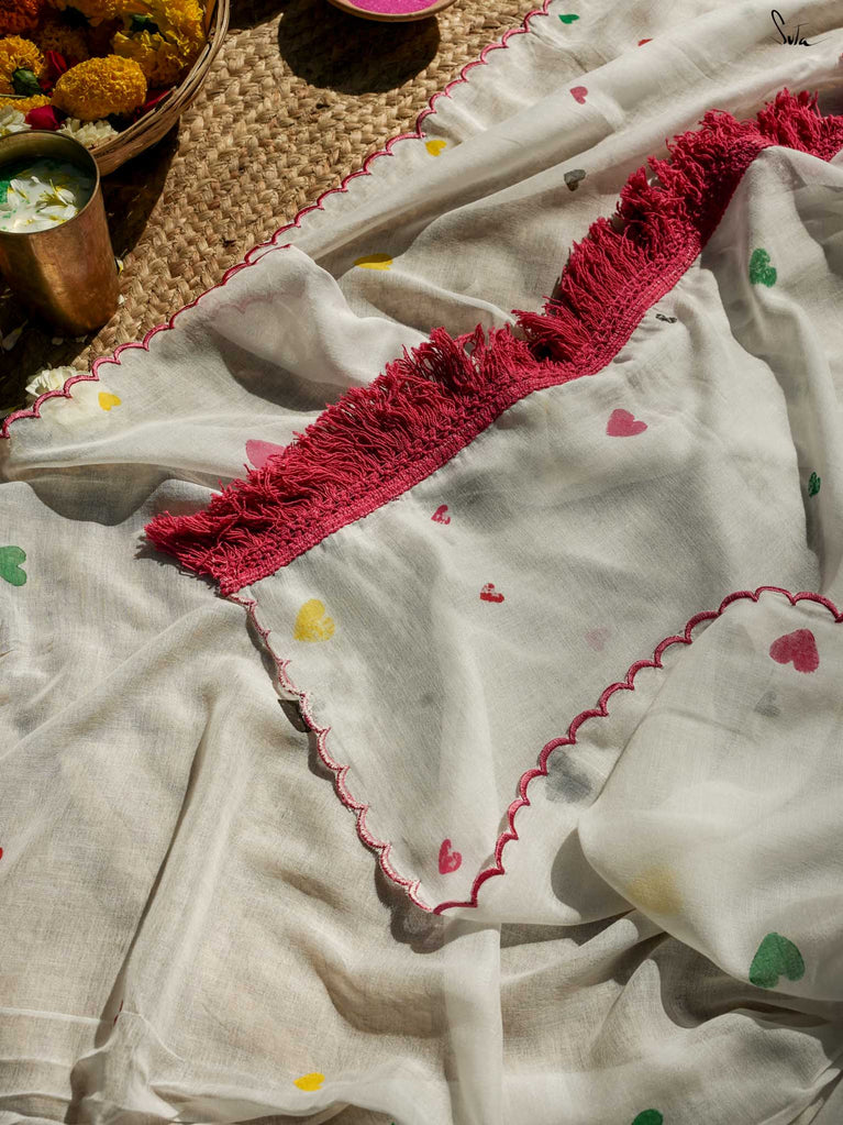 This white sareeis a love letter to Holi itself, a celebration of love stitched into every thread. Each block print & hand-embroidered multicolor heart tells a tale of connection, of moments shared, of memories created on a festival filled with colors. The playful jhalar tassels, with their twinkling charm, add a flutter of excitement, while the scalloped edges bring a soft, romantic feel. It’s the perfect saree for those who wear their heart in the most colorful of ways.