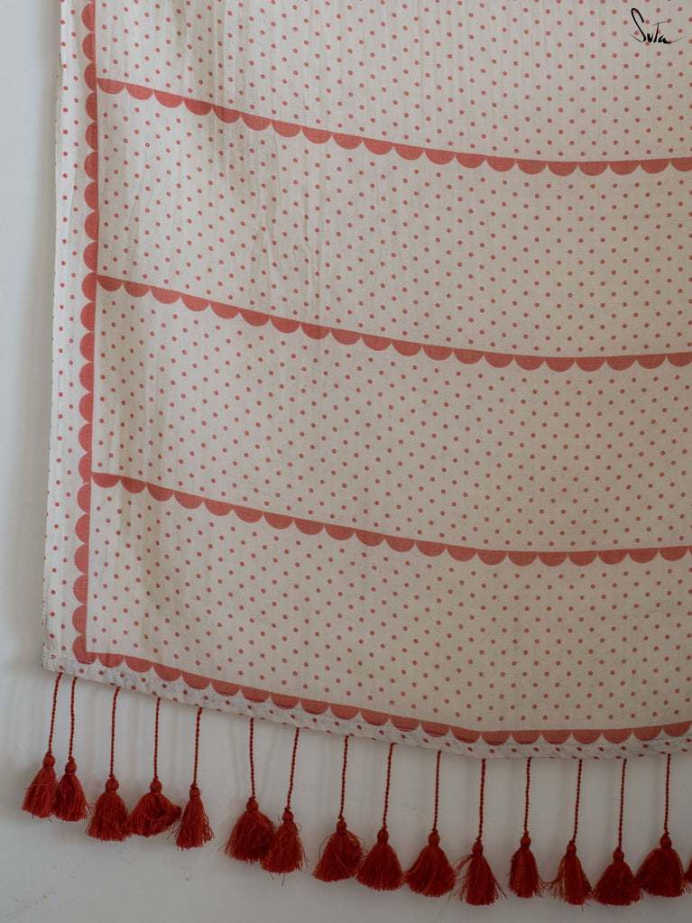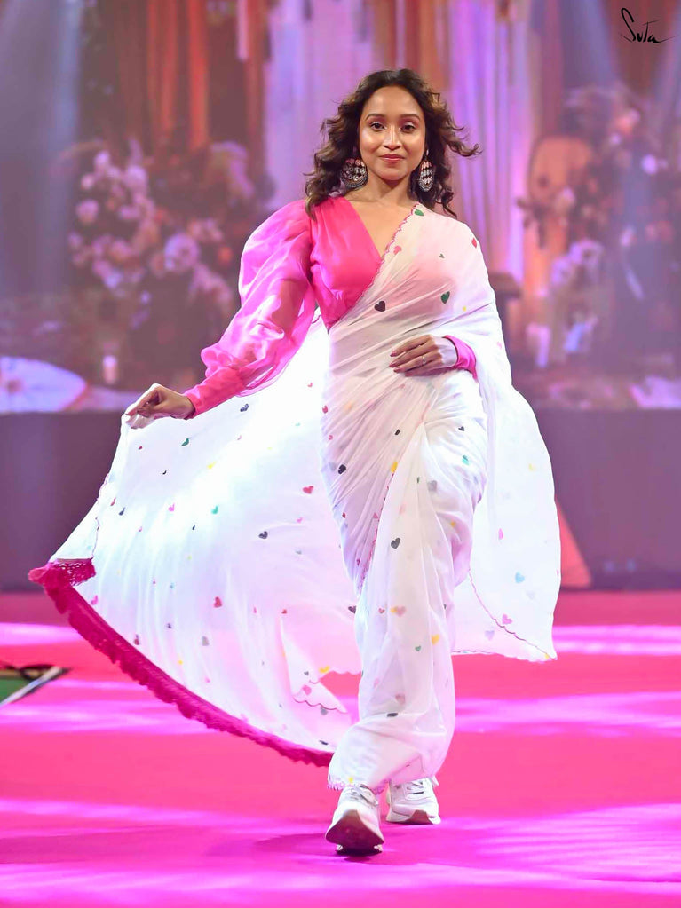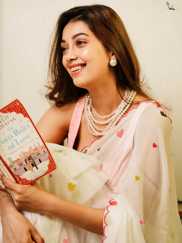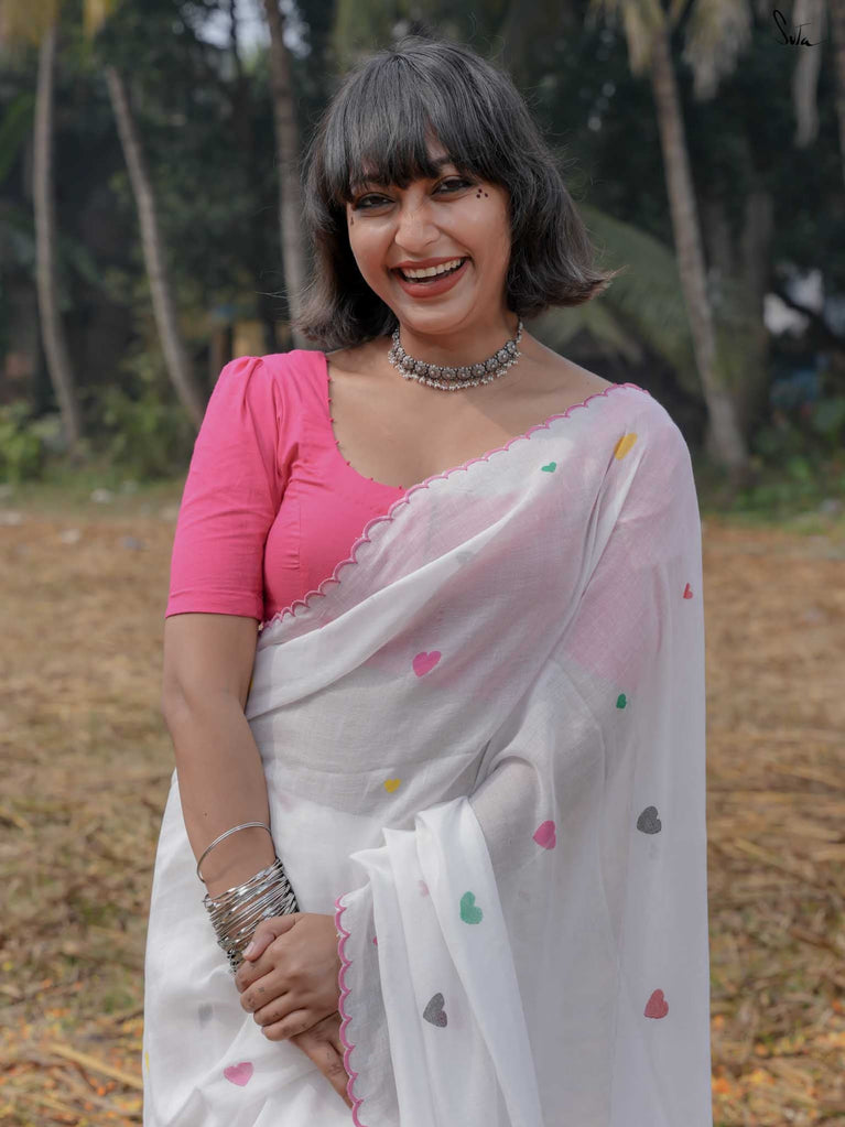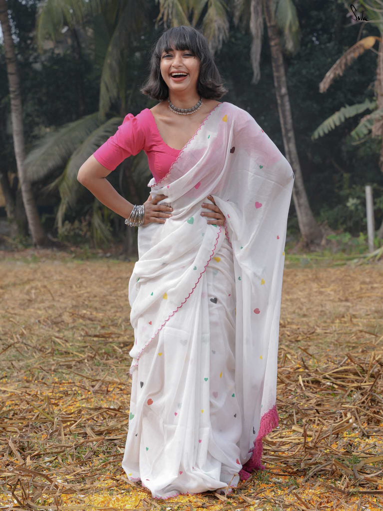 This white sareeis a love letter to Holi itself, a celebration of love stitched into every thread. Each block print & hand-embroidered multicolor heart tells a tale of connection, of moments shared, of memories created on a festival filled with colors. The playful jhalar tassels, with their twinkling charm, add a flutter of excitement, while the scalloped edges bring a soft, romantic feel. It’s the perfect saree for those who wear their heart in the most colorful of ways.