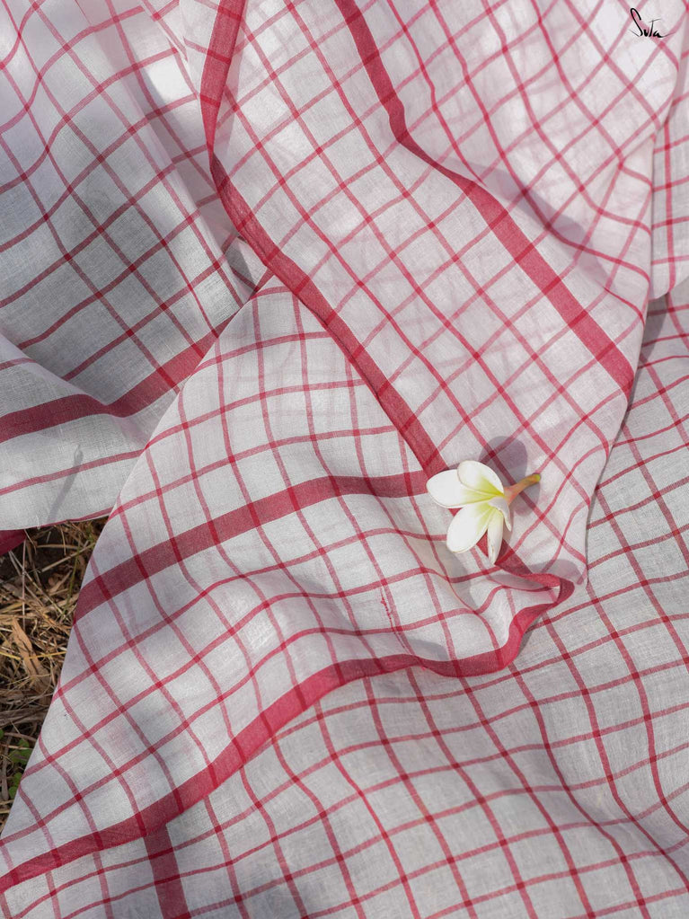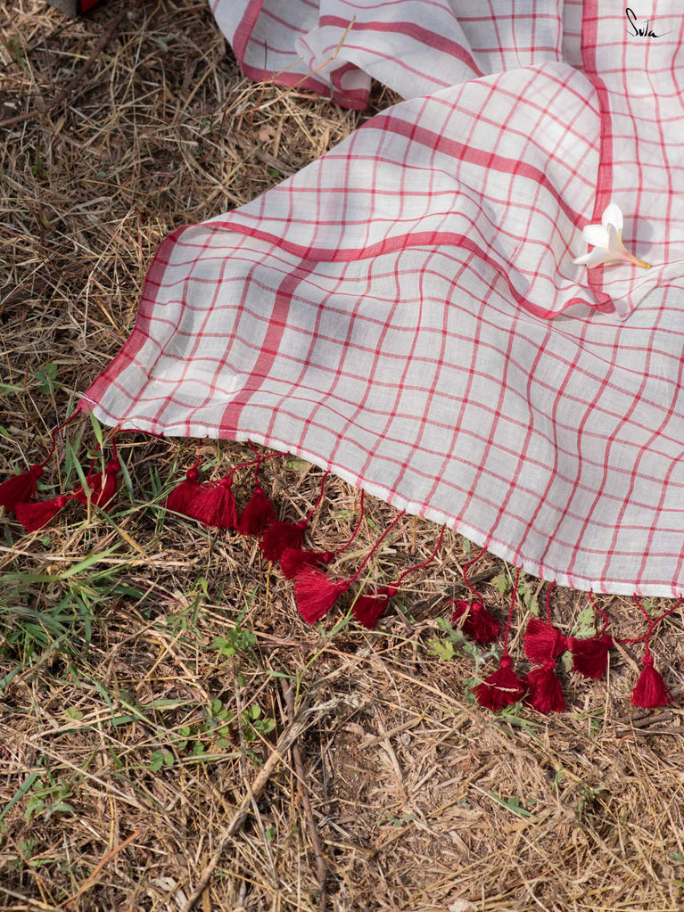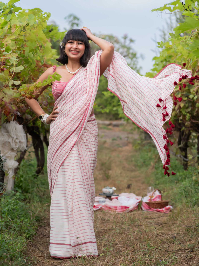 Imagine the flutter of a heartbeat that skips a beat, the rhythm quickening with every thought of love. Dil on Grid captures this very essence in its weave. Crafted from soft mul cotton, the saree features delicate off-white, maroon checks and stripes, coming together in a harmonious visual melody. Playful maroon tassels dance gracefully along the pallu, bringing a hint of charm to the ensemble. This saree comes with a matching striped blouse piece attached.