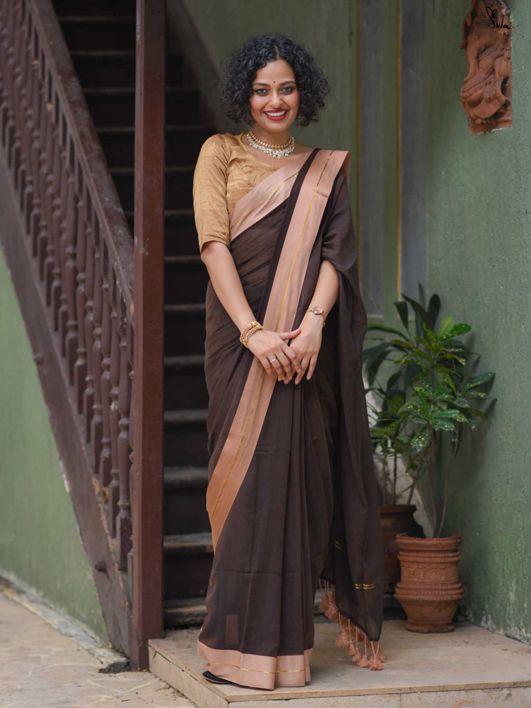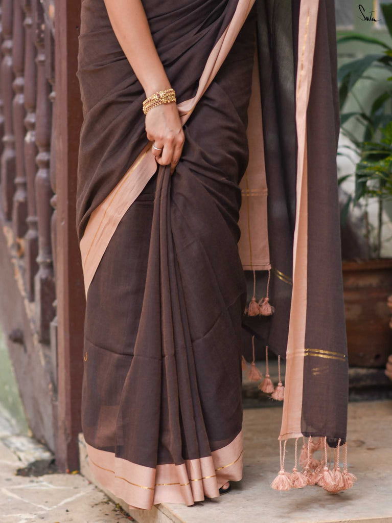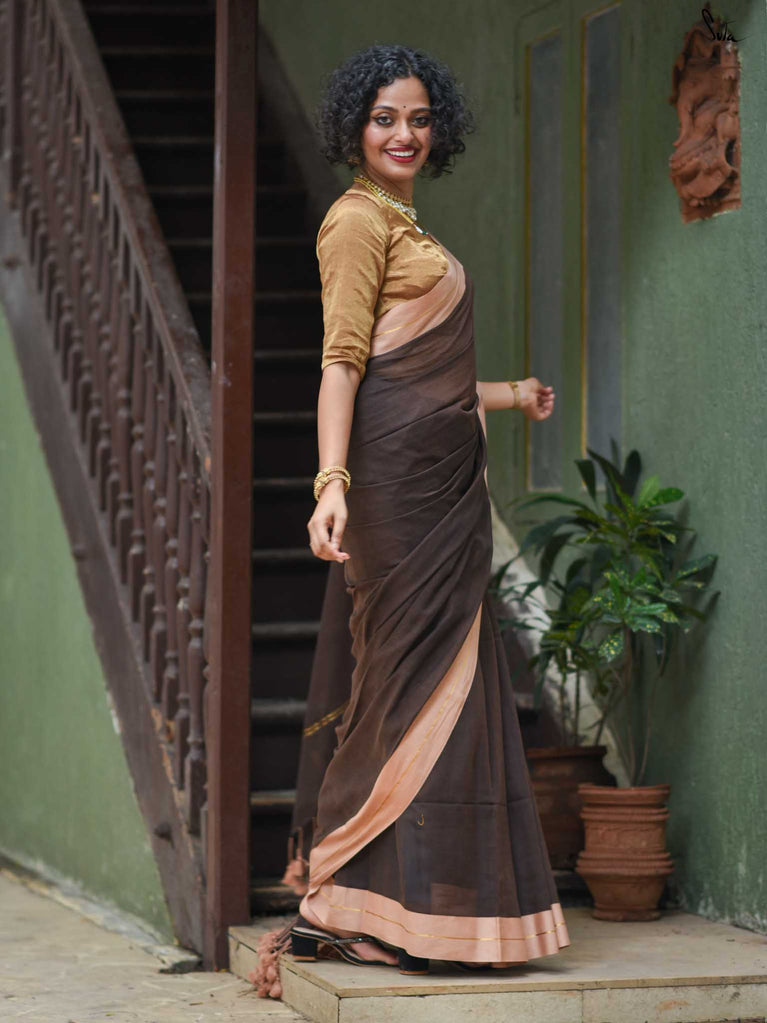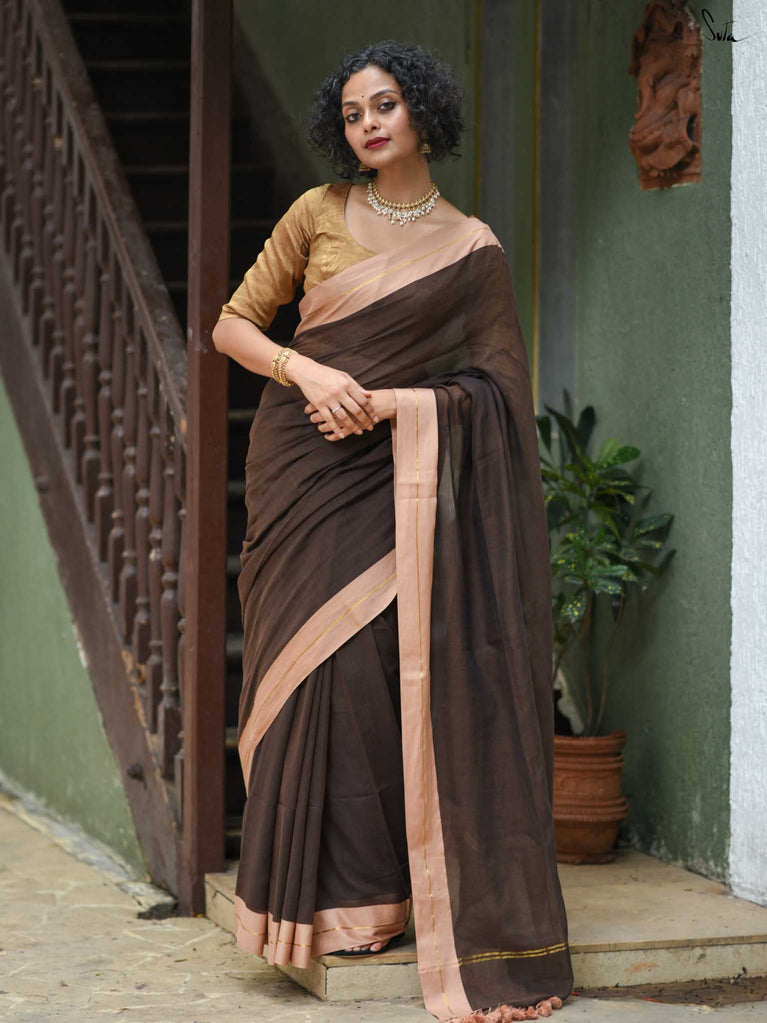 Earthy and comfortable, Dal Chini blends deep brown hues with a subtle zari border for a refined look. The beige jhalar tassels add softness to the rich woven mul cotton drape. A versatile choice for formal day events or understated festive occasions.